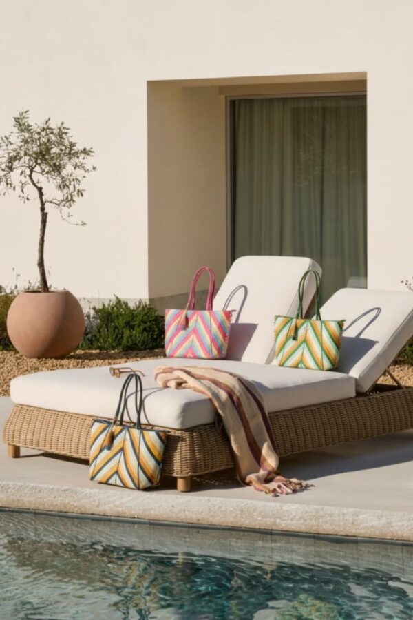 El shopper de esta colección es de esos bolsos que lo tienen todo: estilo, comodidad y un diseño que te acompaña igual de bien en la playa que en tu día a día. Está confeccionado en un tejido de punto elástico, muy suave y flexible, con líneas combinadas en distintos colores que le dan un aire divertido y fresco.