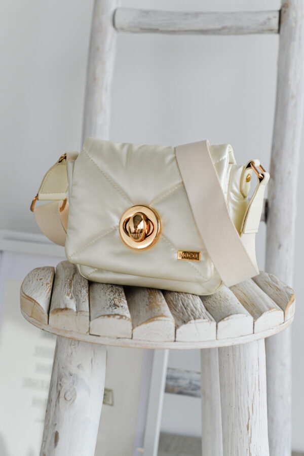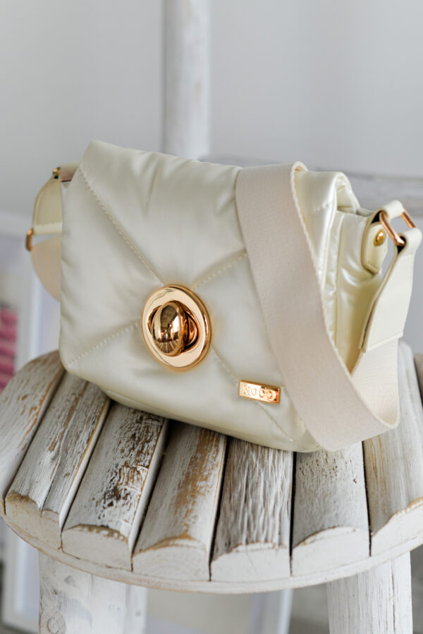 Su tapa superior con cierre dorado grande y llamativo mantiene el estilo icónico de la colección, mientras que la correa de algodón ajustable te permite llevarla a la altura que más te guste, combinando confort y versatilidad.