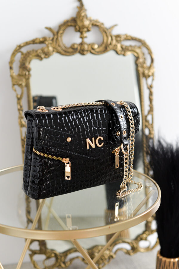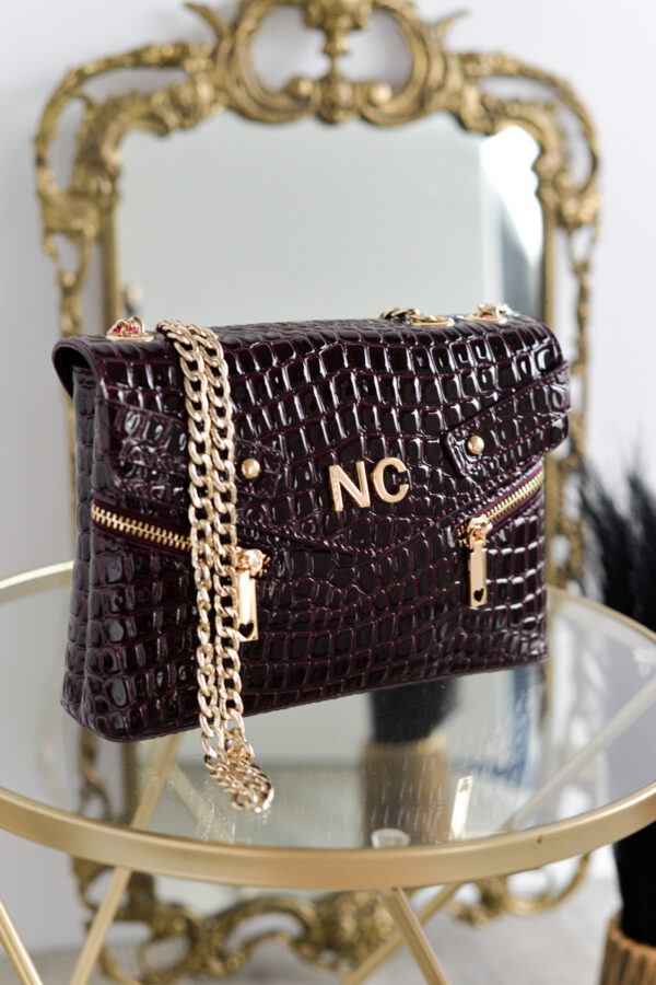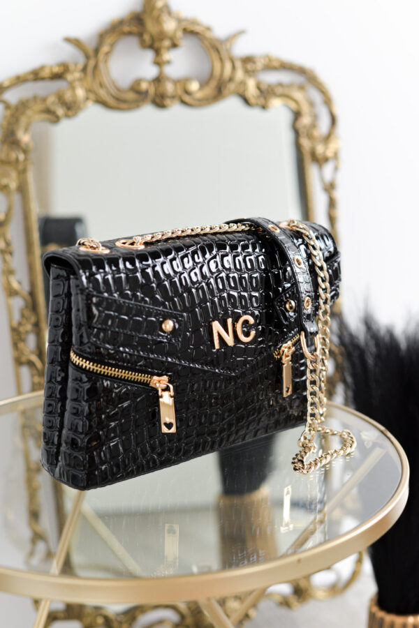 Esta bandolera pequeña de charol con textura de cocodrilo combina sofisticación y versatilidad en un formato compacto pero con mucha presencia.