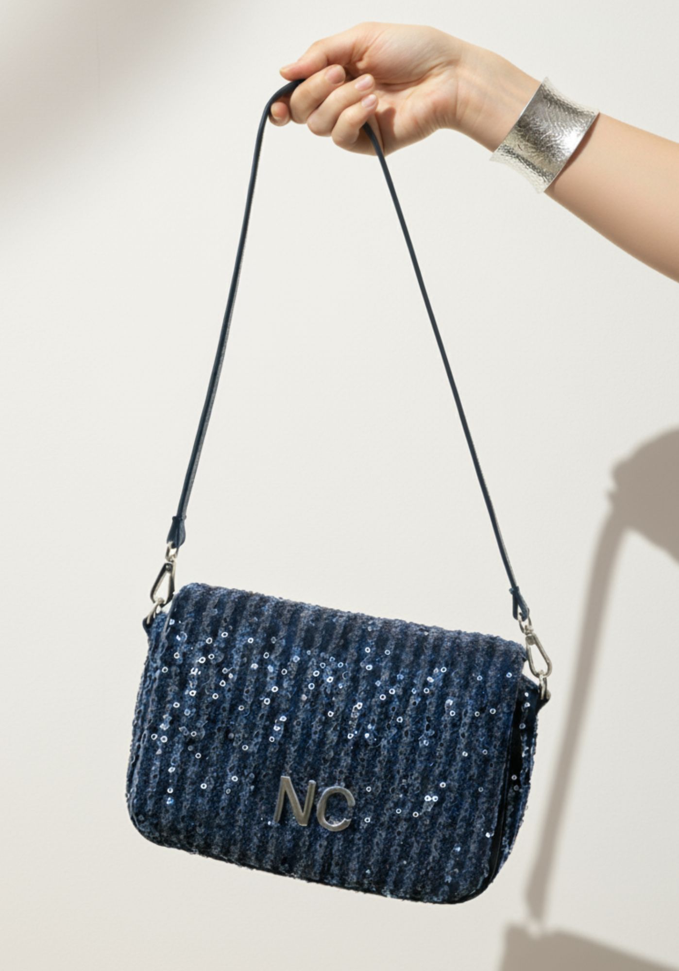 Bandolera mediana NOCO diseñada en tejido vaquero denim con incrustaciones cosidas de lentejuelas, un material elegante y muy especial que aporta brillo sutil y personalidad al diseño. La combinación del denim con los detalles en piel sintética en tono plateado crea un contraste moderno y sofisticado, perfecto para elevar cualquier look.