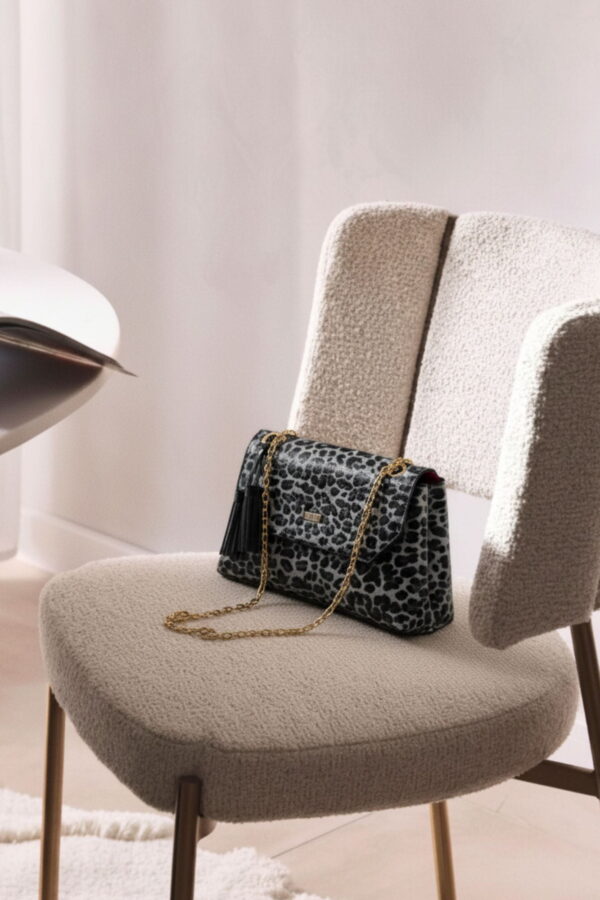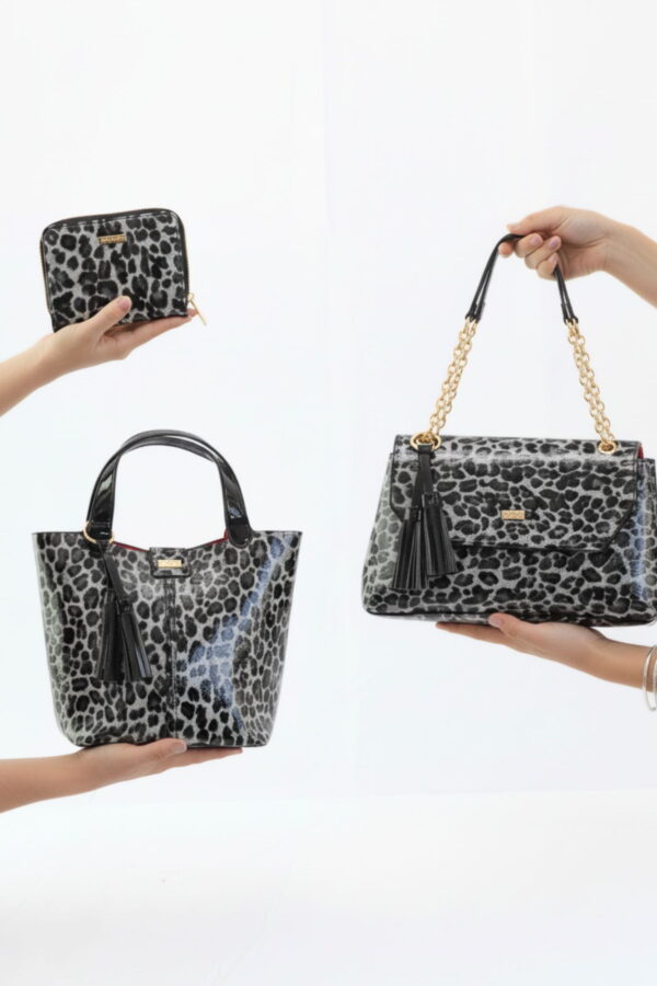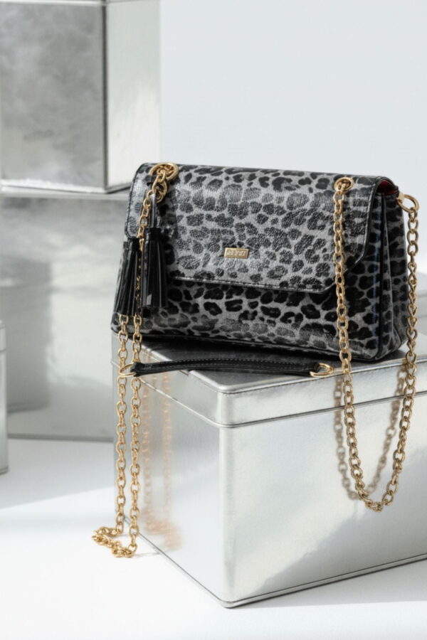 Esta bandolera grande con tapa de Noco forma parte de la colección diseñada en charol con estampado de leopardo en tonos grises y negros, con detalles en charol negro liso y el característico interior en rosa fucsia que define la línea.