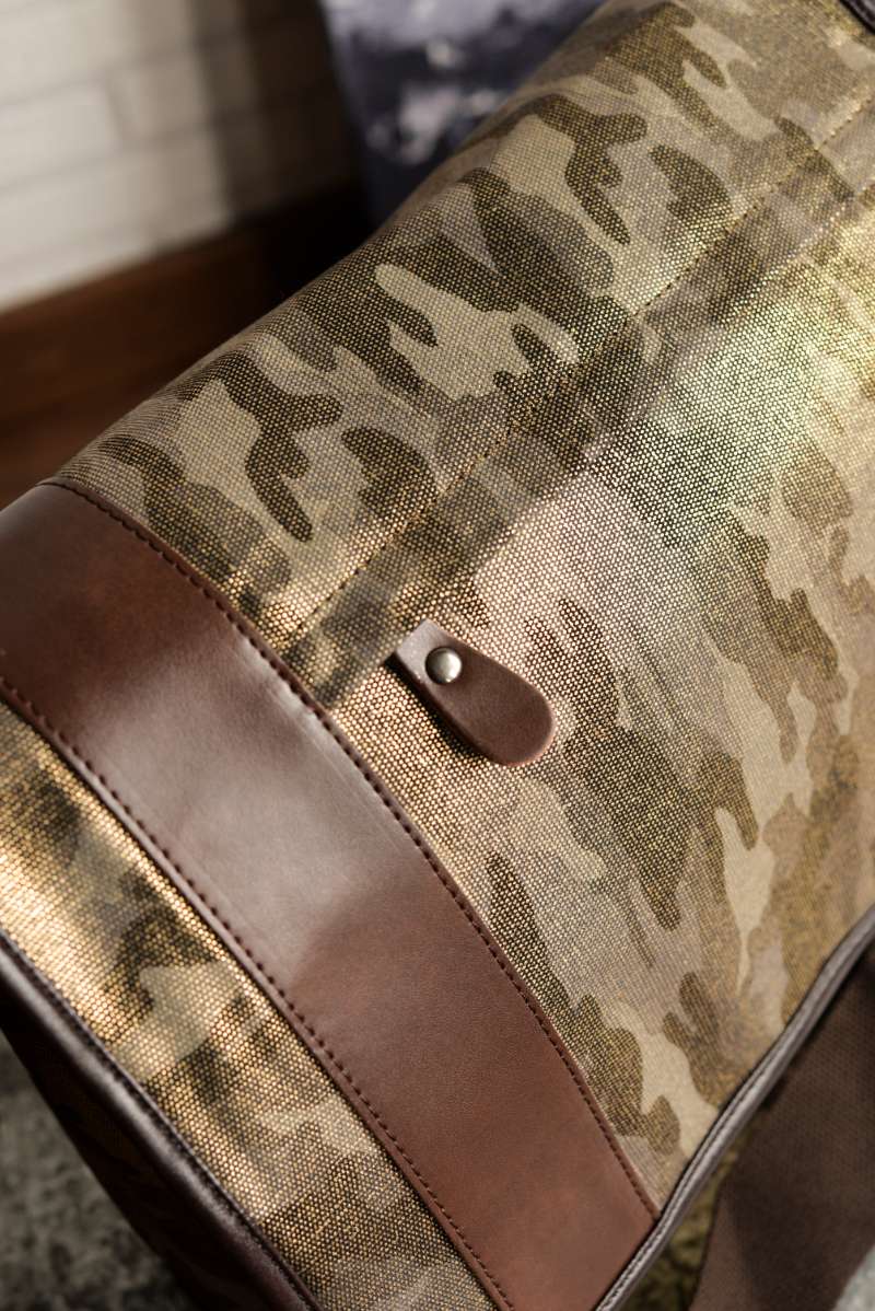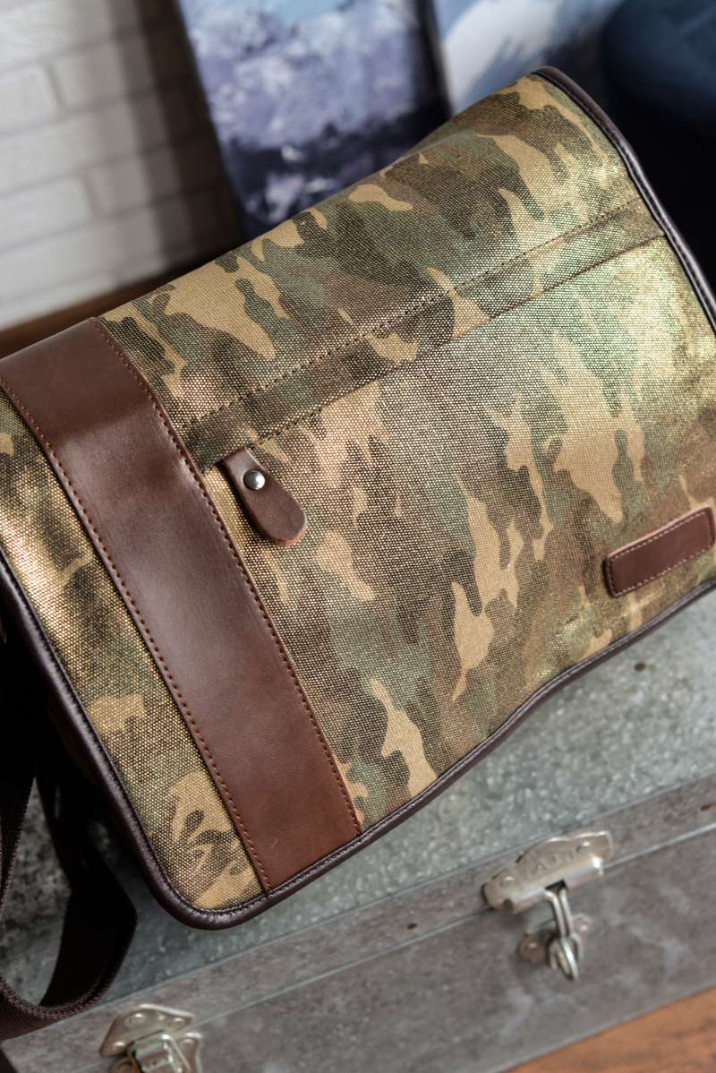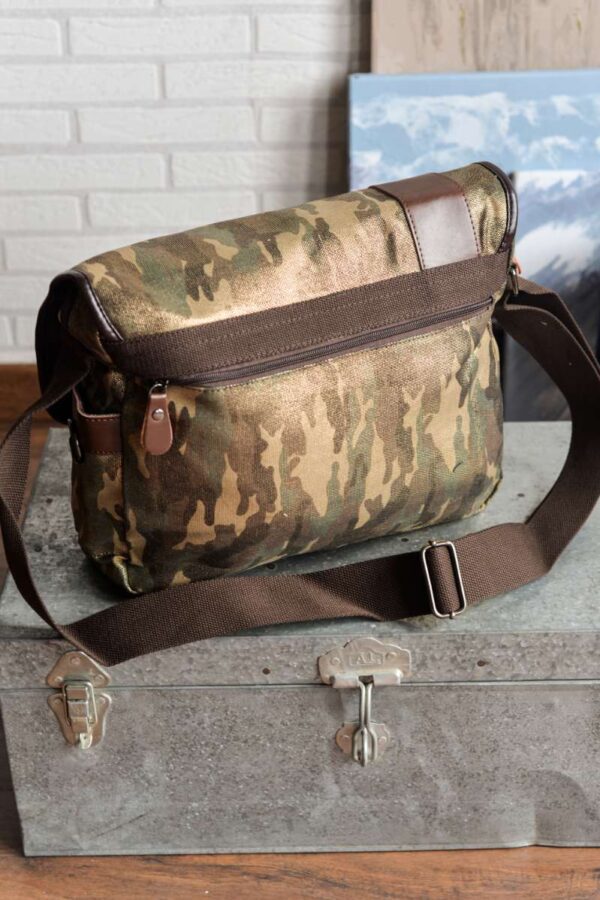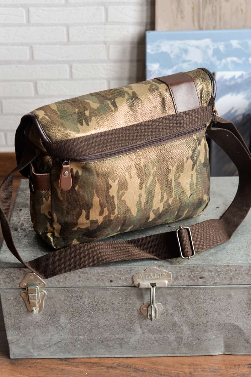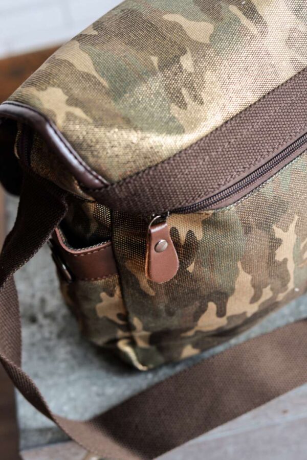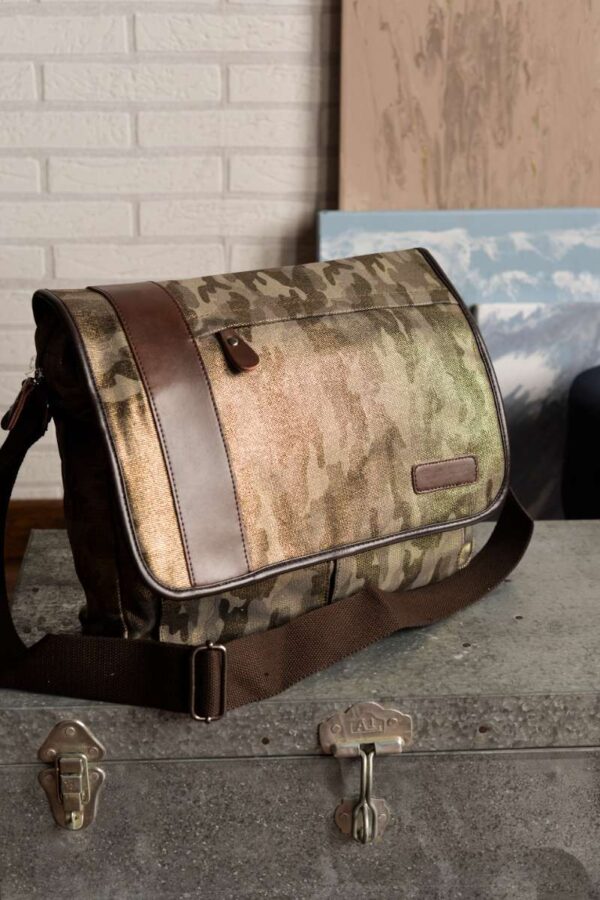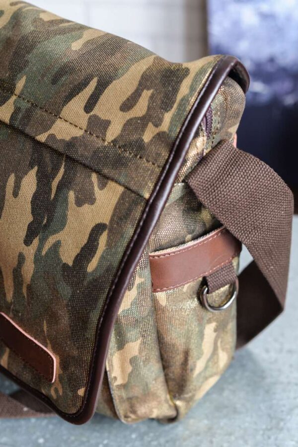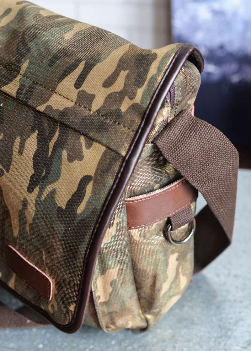 Bandolera unisex de formato alargado diseñada en lona gruesa de camuflaje con acabado brillante. Detalles en piel color chocolate.