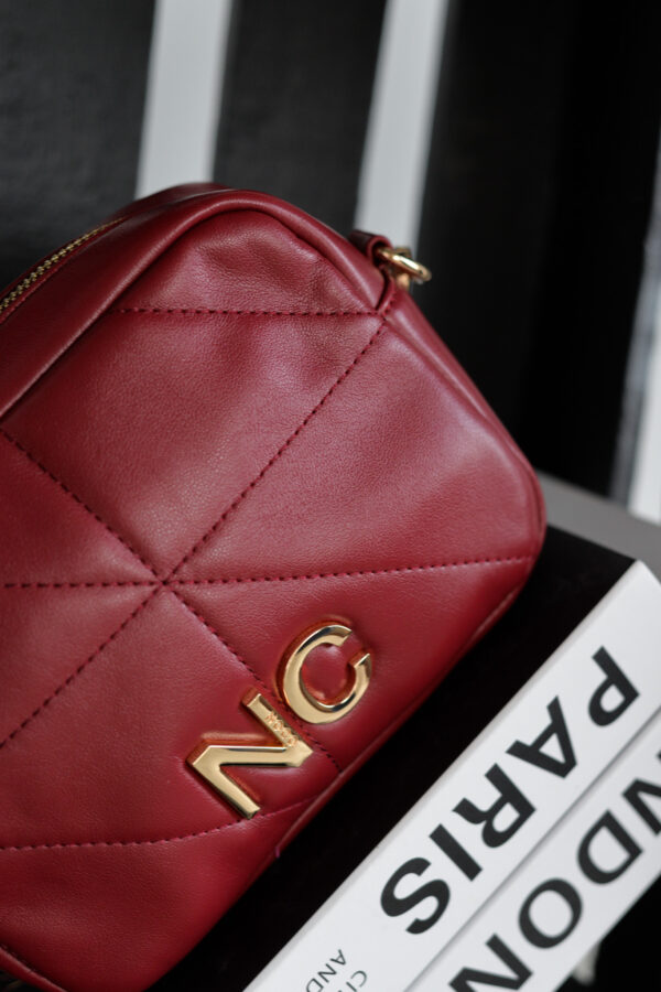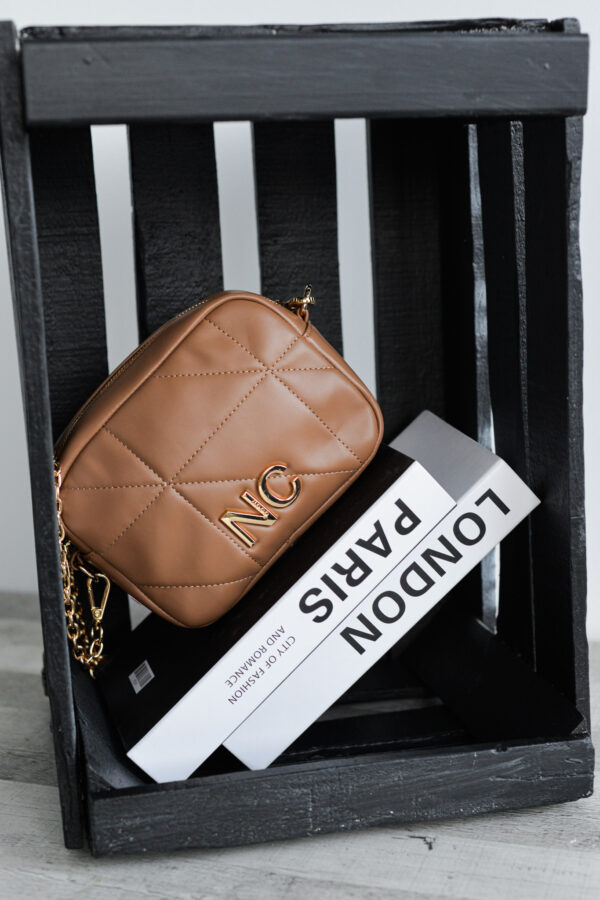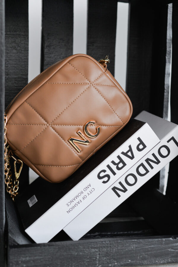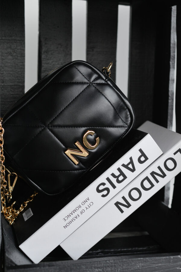 Cuenta con una cremallera superior que asegura todo su contenido, y una cadena dorada con detalle de aplique en piel vegana para el hombro, que añade confort y un toque elegante.