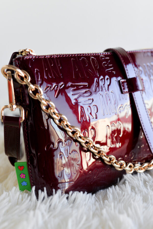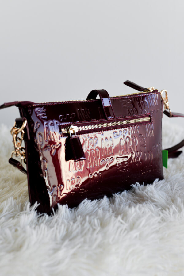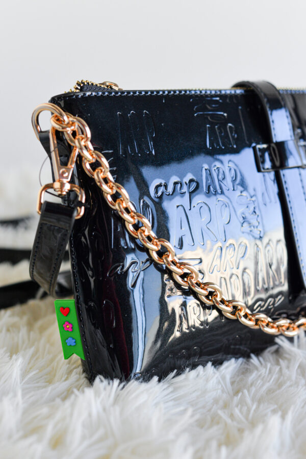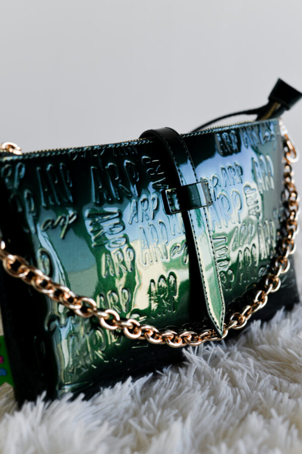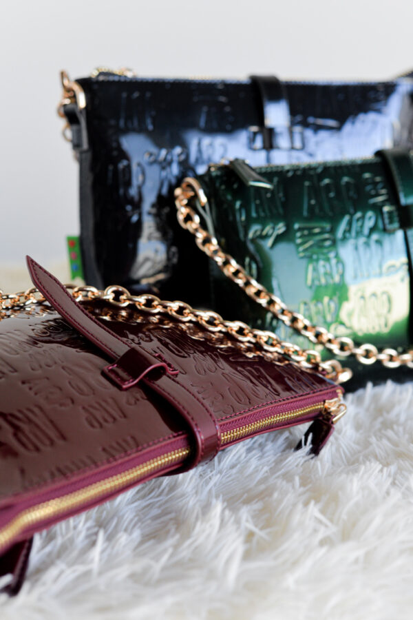 Diseño elegante y multifuncional en una sola pieza. Esta bandolera plana, que también puede usarse como cartera de mano, está confeccionada en charol estructurado con el logo ARP grabado, aportando textura y personalidad a cualquier look.