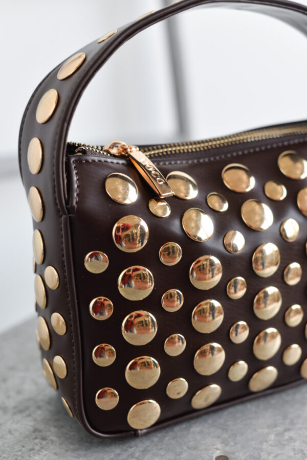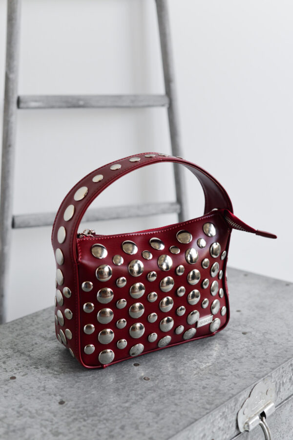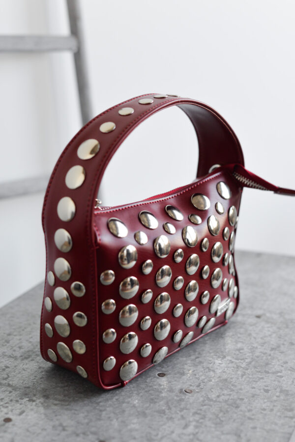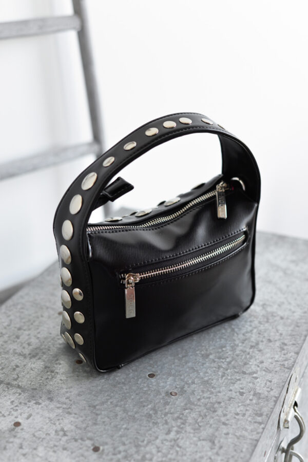 Bandolera de piel sintética gruesa es el complemento perfecto para llevar tu estilo al siguiente nivel. Cubierta de tachuelas grandes, mantiene ese aire rebelde pero sofisticado que define la colección.