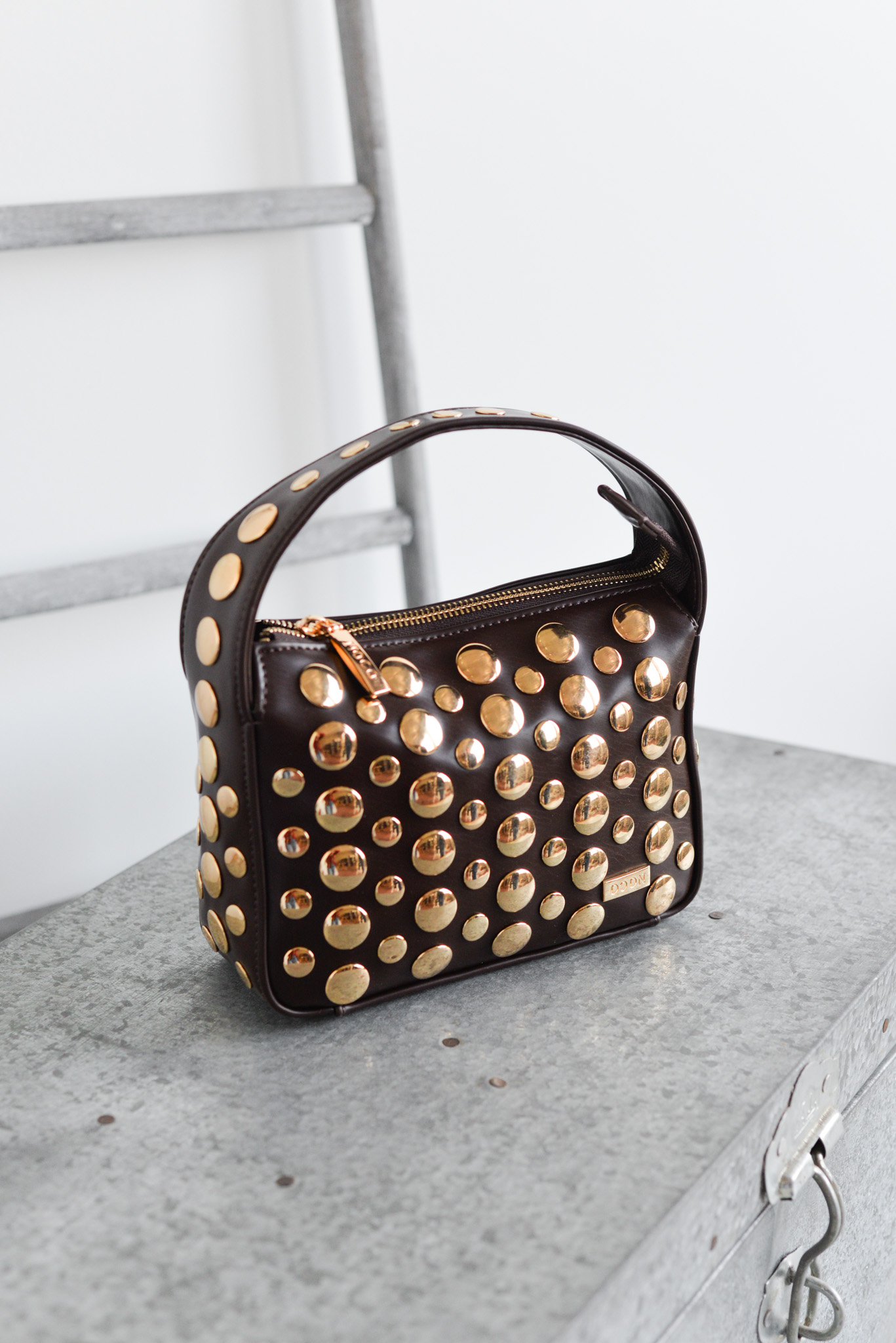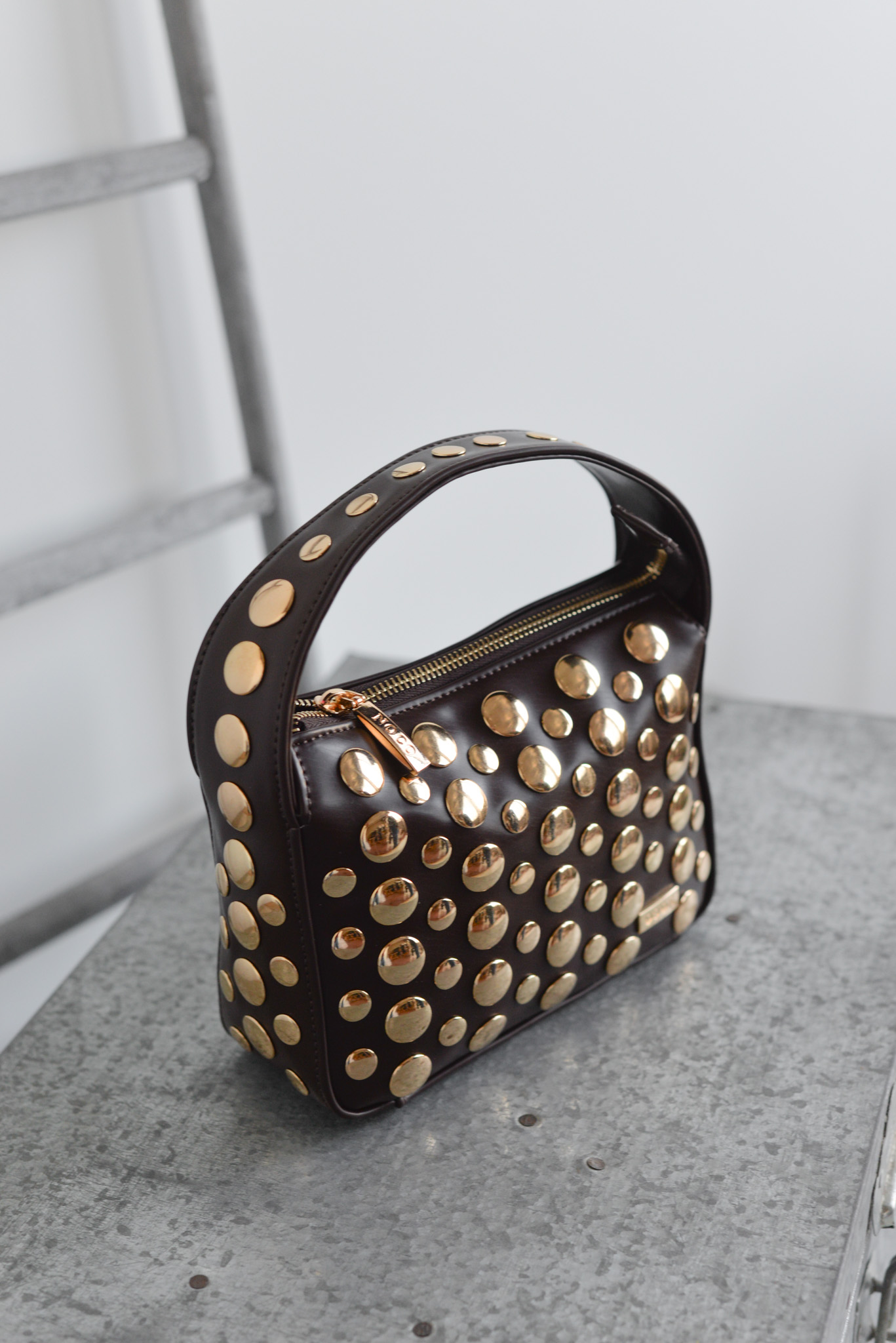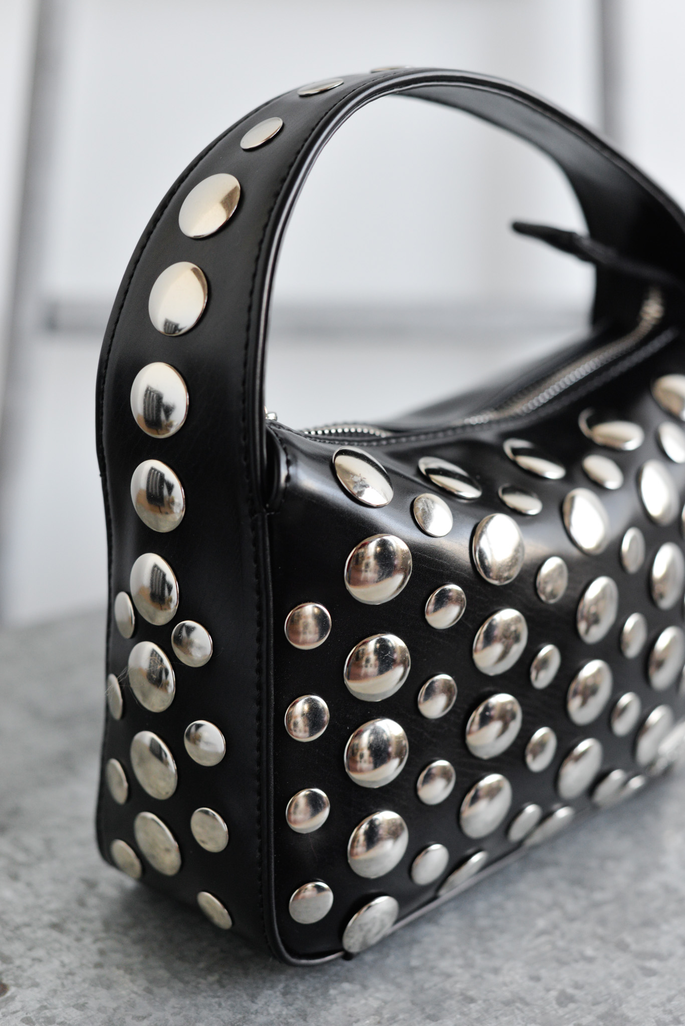 Bandolera de piel sintética gruesa es el complemento perfecto para llevar tu estilo al siguiente nivel. Cubierta de tachuelas grandes, mantiene ese aire rebelde pero sofisticado que define la colección.