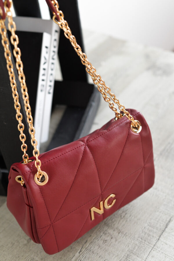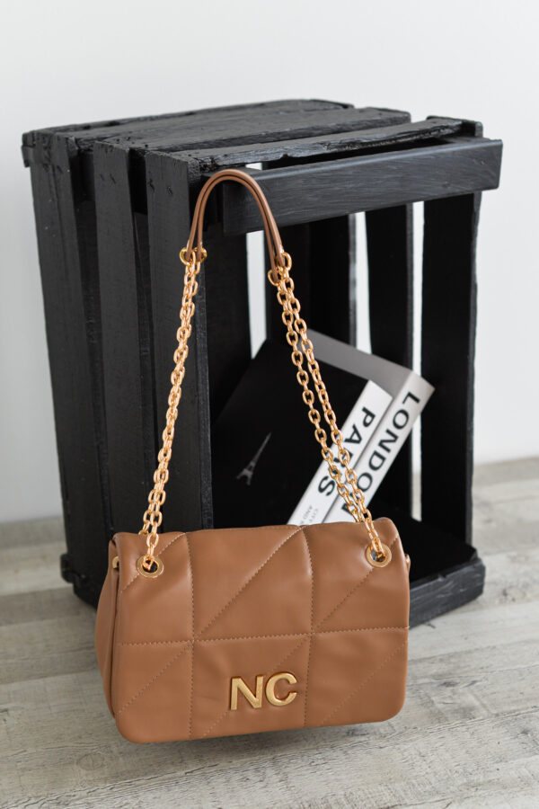 Cuenta con una tapa superior que asegura tus pertenencias y una cadena dorada con aplique de piel vegana en el hombro, que añade comodidad y un toque sofisticado.