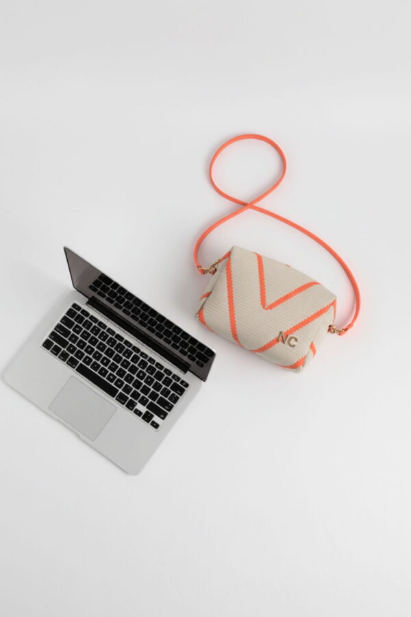 Esta bandolera mediana de Noco, confeccionada en punto estructurado, combina diseño moderno y funcionalidad en un formato práctico y elegante. Su estampado de líneas diagonales a contraste sobre base blanca roto aporta un toque veraniego y urbano, ideal para mujeres que buscan estilo sin sacrificar comodidad.