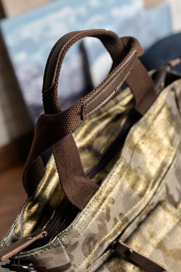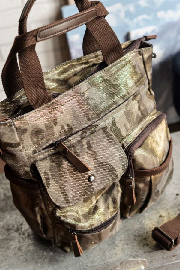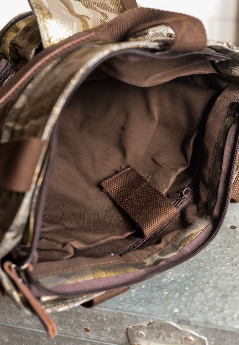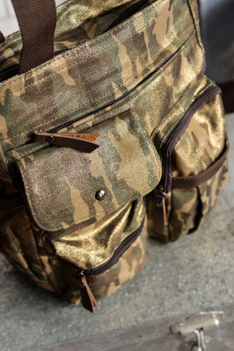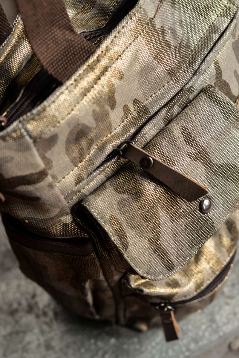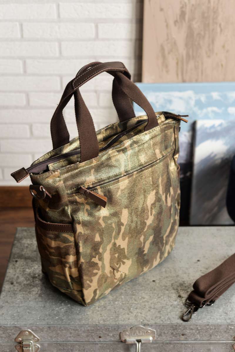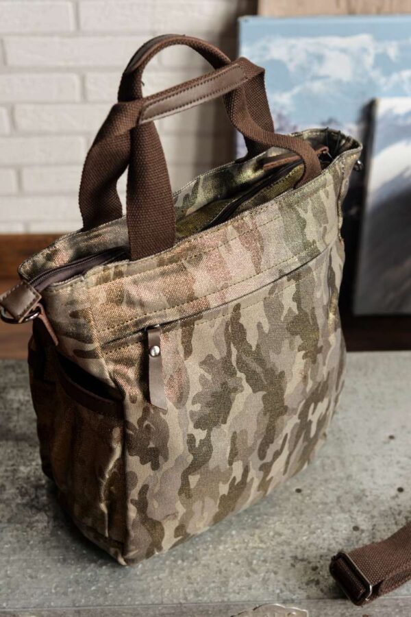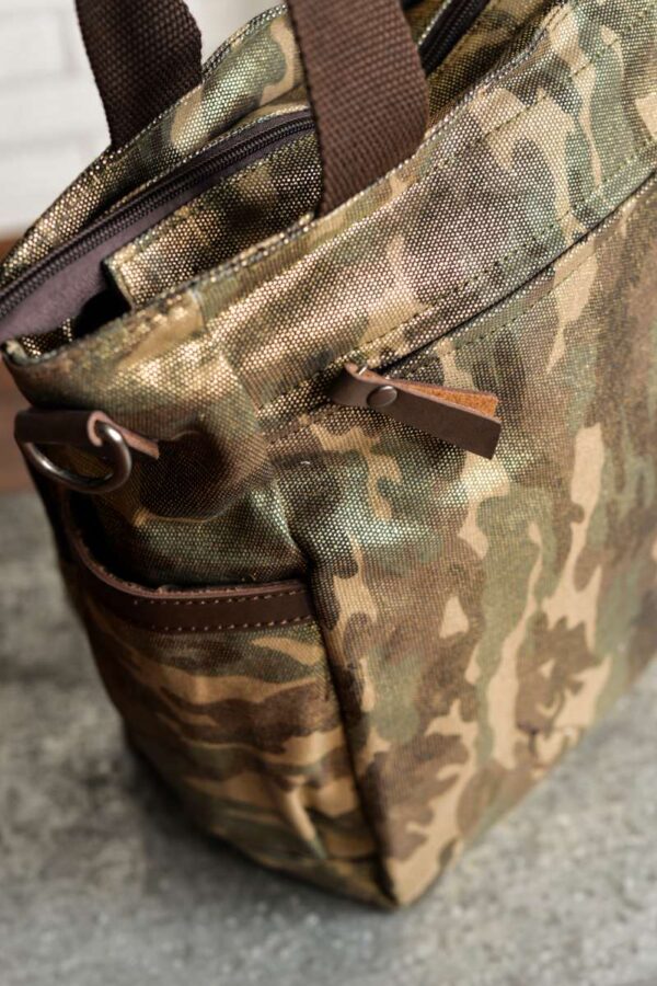 Bolsa unisex diseñada en lona gruesa de camuflaje con acabado brillante. Detalles en piel de color chocolate.