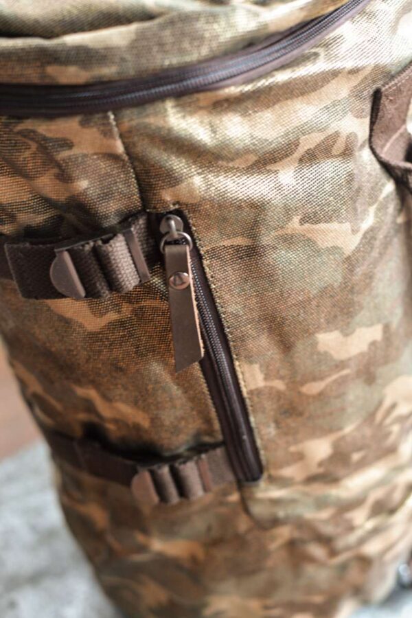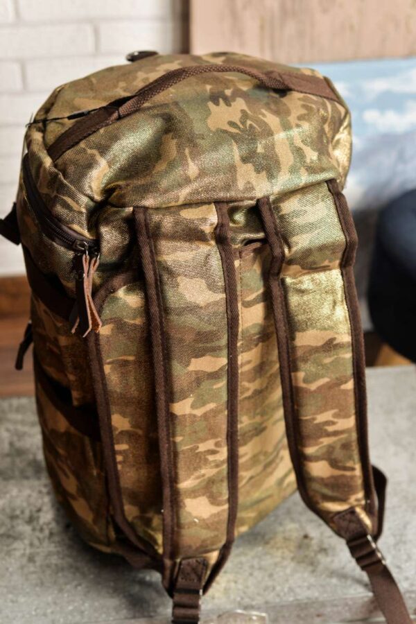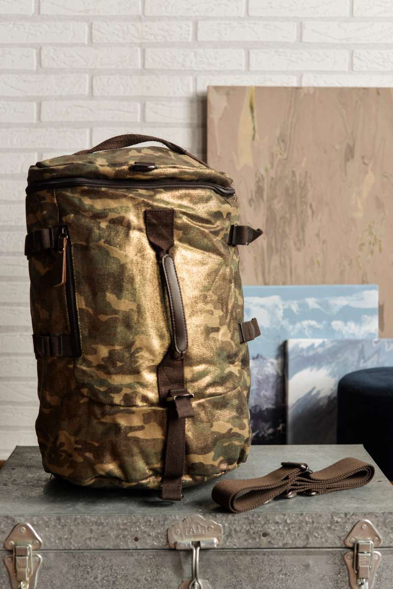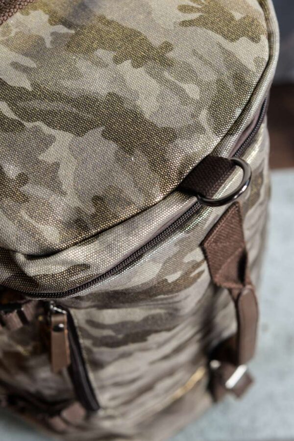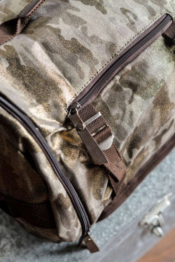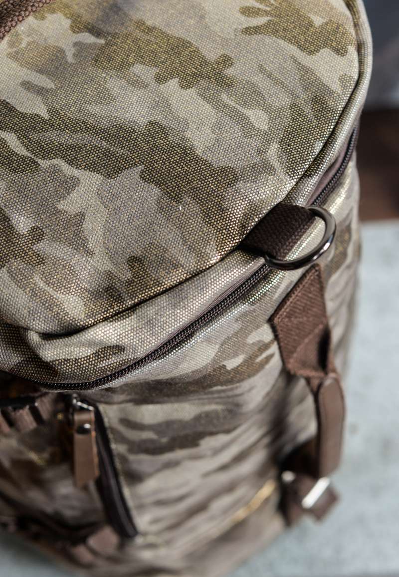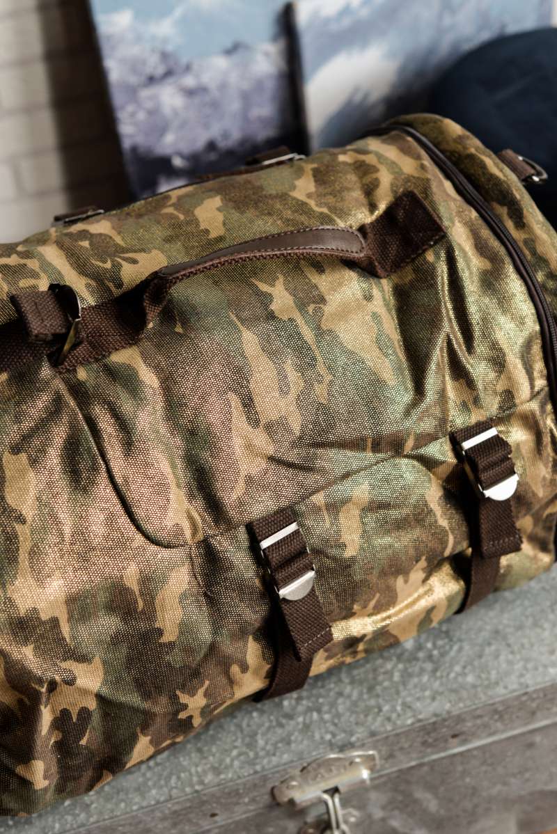 Bandolera unisex de formato alargado diseñada en lona gruesa de camuflaje con acabado brillante. Detalles en piel color chocolate.