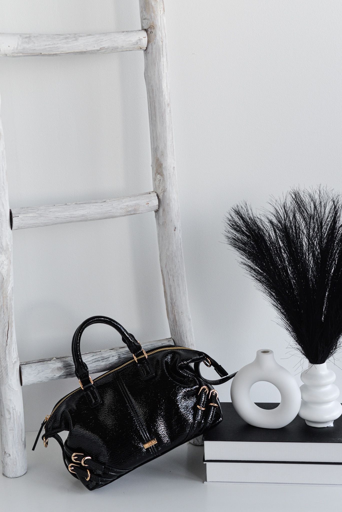 Bolso bowling en charol negro texturizado, una mezcla perfecta entre lo clásico y lo actual. Con un tamaño mediano ideal para el día a día o eventos especiales, este modelo destaca por su firmeza y su diseño pulido.