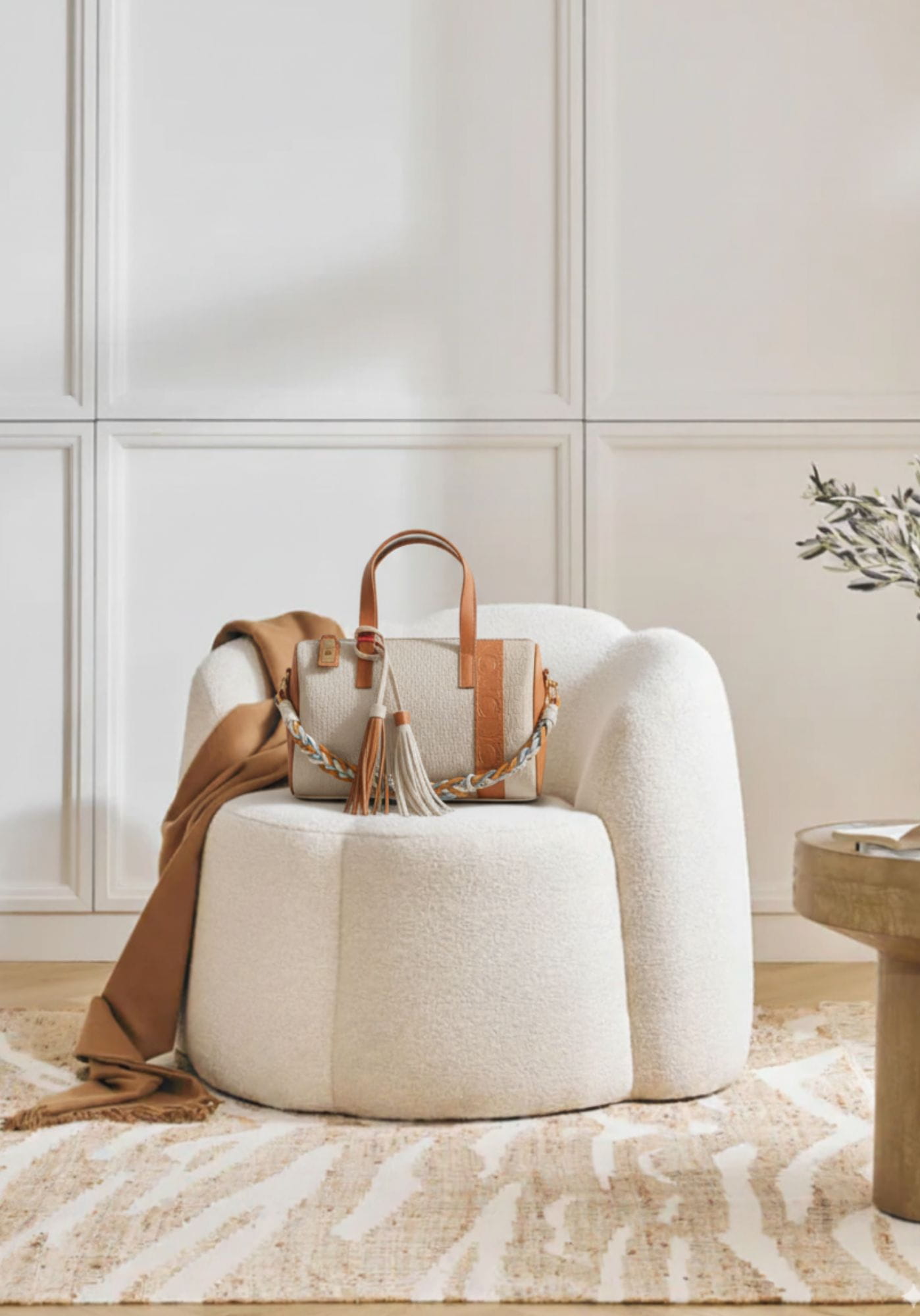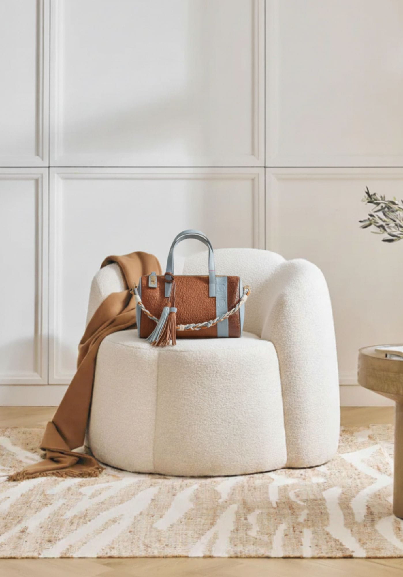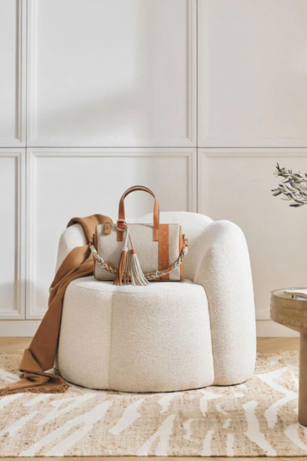 El cuerpo está confeccionado en piel sintética grabada con el monograma Noco, acompañado de una tira central a contraste con las iniciales NC y una franja lateral en charol, que aporta un sutil brillo al conjunto. Incluye una asa corta decorativa de cordón de algodón en tres colores y un pompón decorativo a juego, que refuerzan el carácter sofisticado y femenino del modelo.