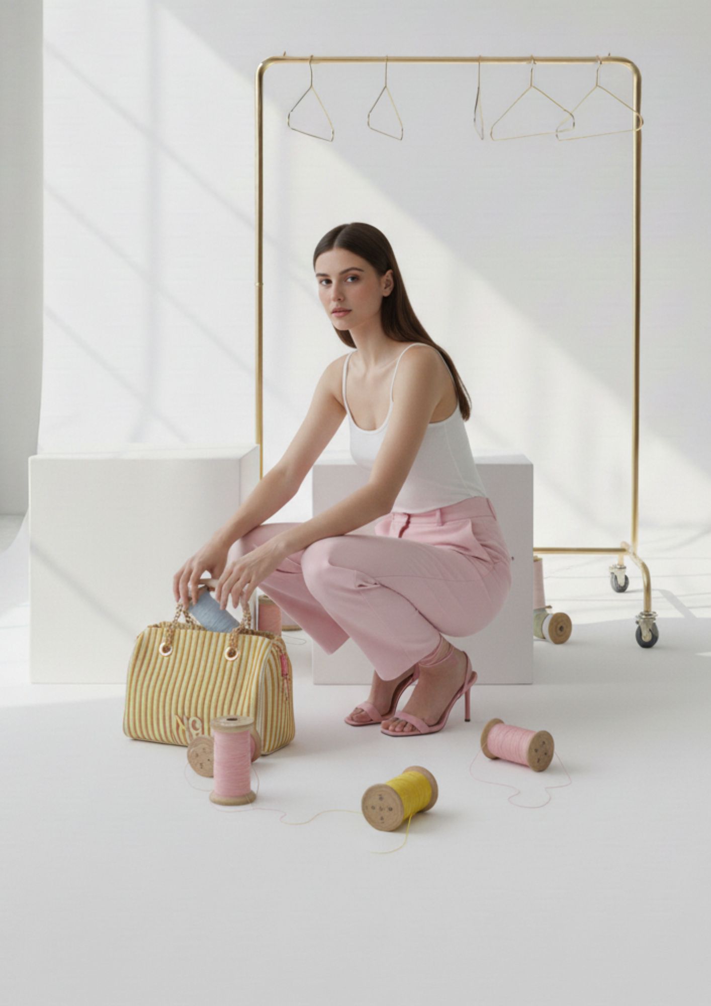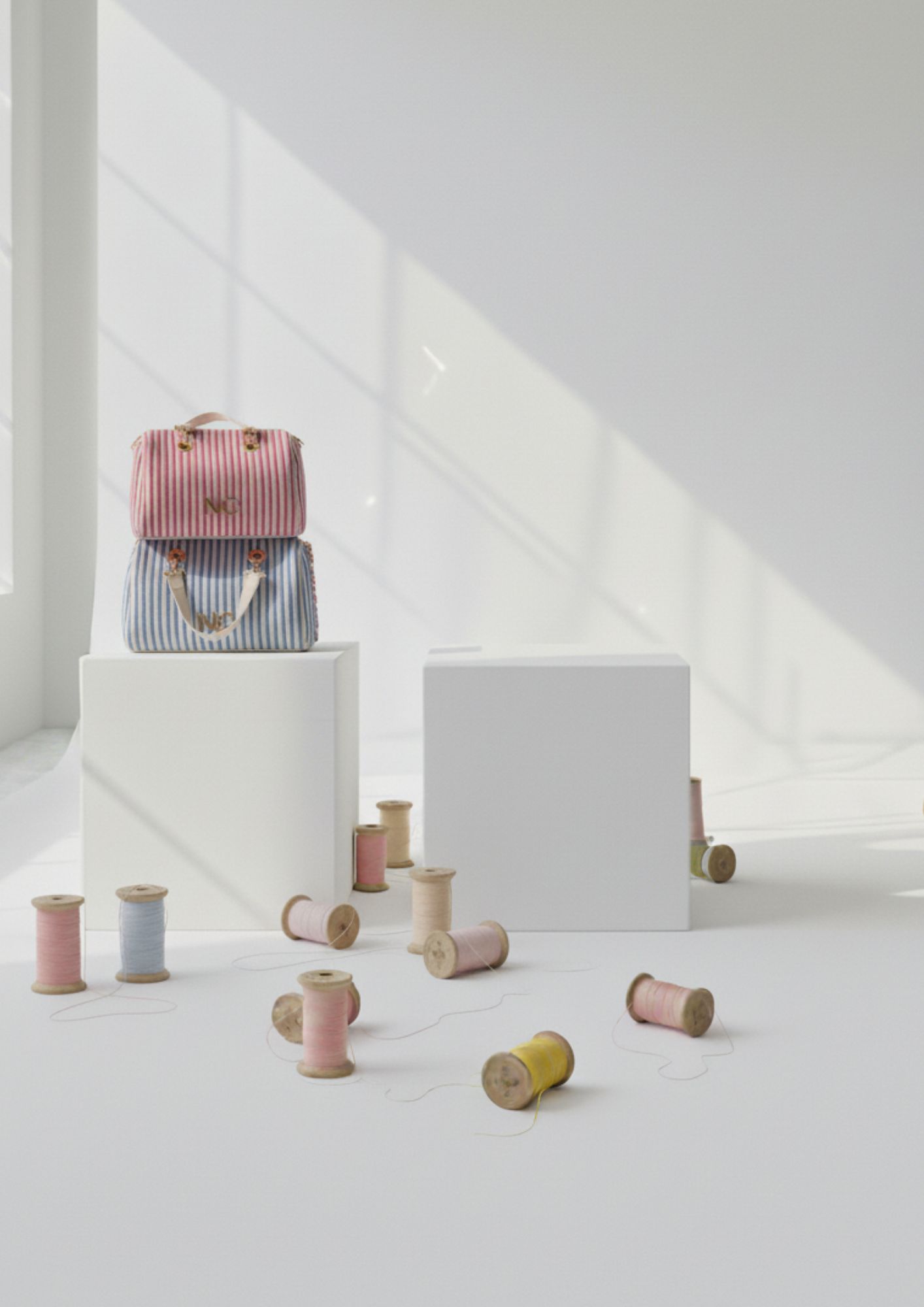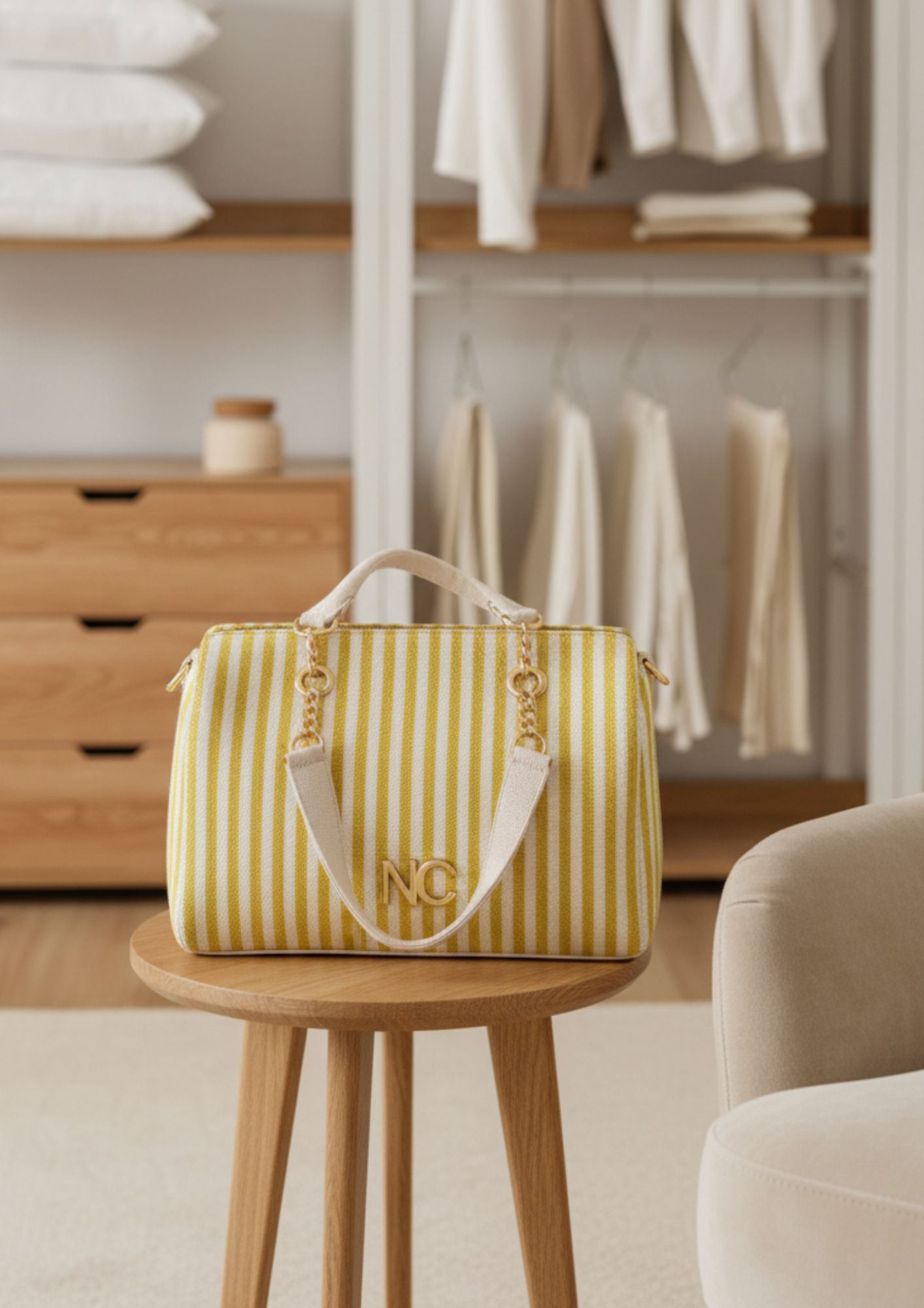 Confeccionado en lona a rayas con textura y relieve, combina una base beige luminosa con rayas de color que aportan frescura y personalidad. Disponible en amarillo, rosa o azul, es ideal para acompañar cualquier look veraniego.