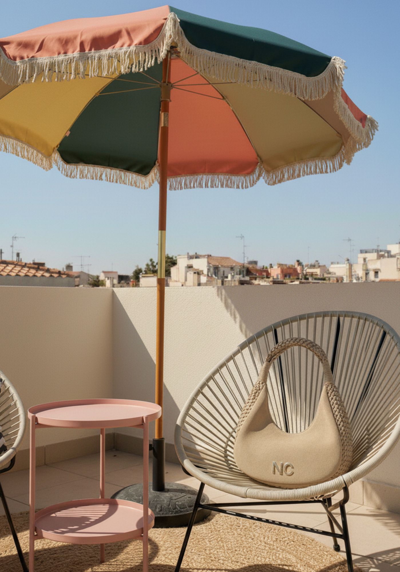 Bolso hobo tipo góndola ovalado de antelina en colores pastel, diseñado para mujeres que buscan un bolso amplio, elegante y funcional. Incluye detalle trenzado en piel vegana en los laterales, aportando un toque moderno y distintivo. Su cierre superior con cremallera garantiza seguridad y comodidad. Este modelo amplio es perfecto para llevar todos tus esenciales de manera organizada, ligera y con estilo en cualquier look urbano o veraniego.