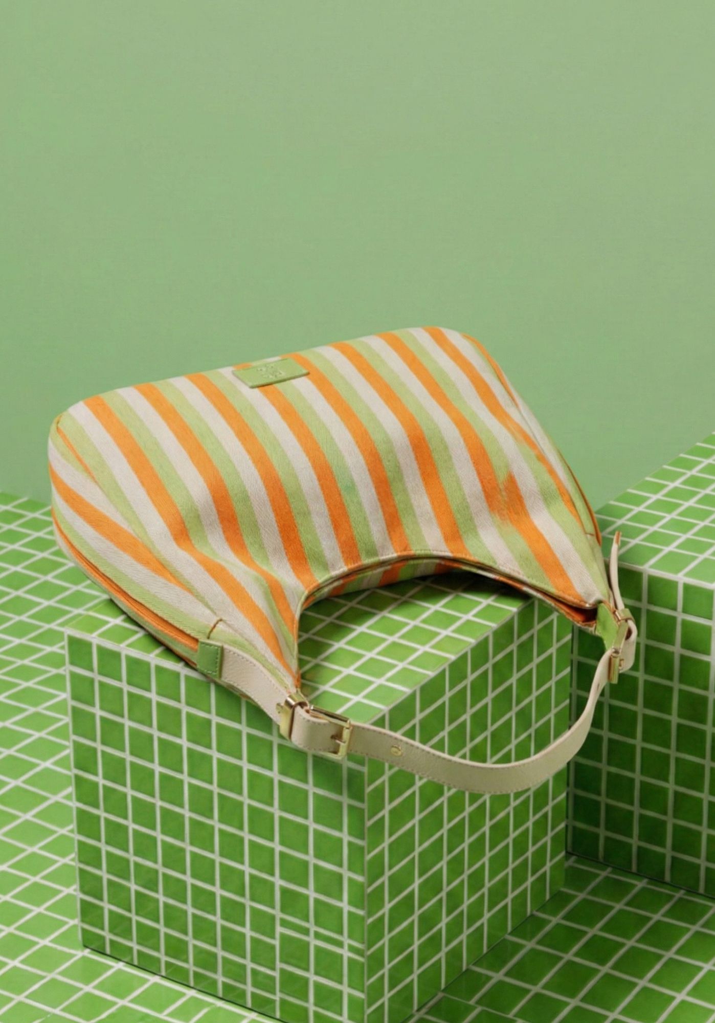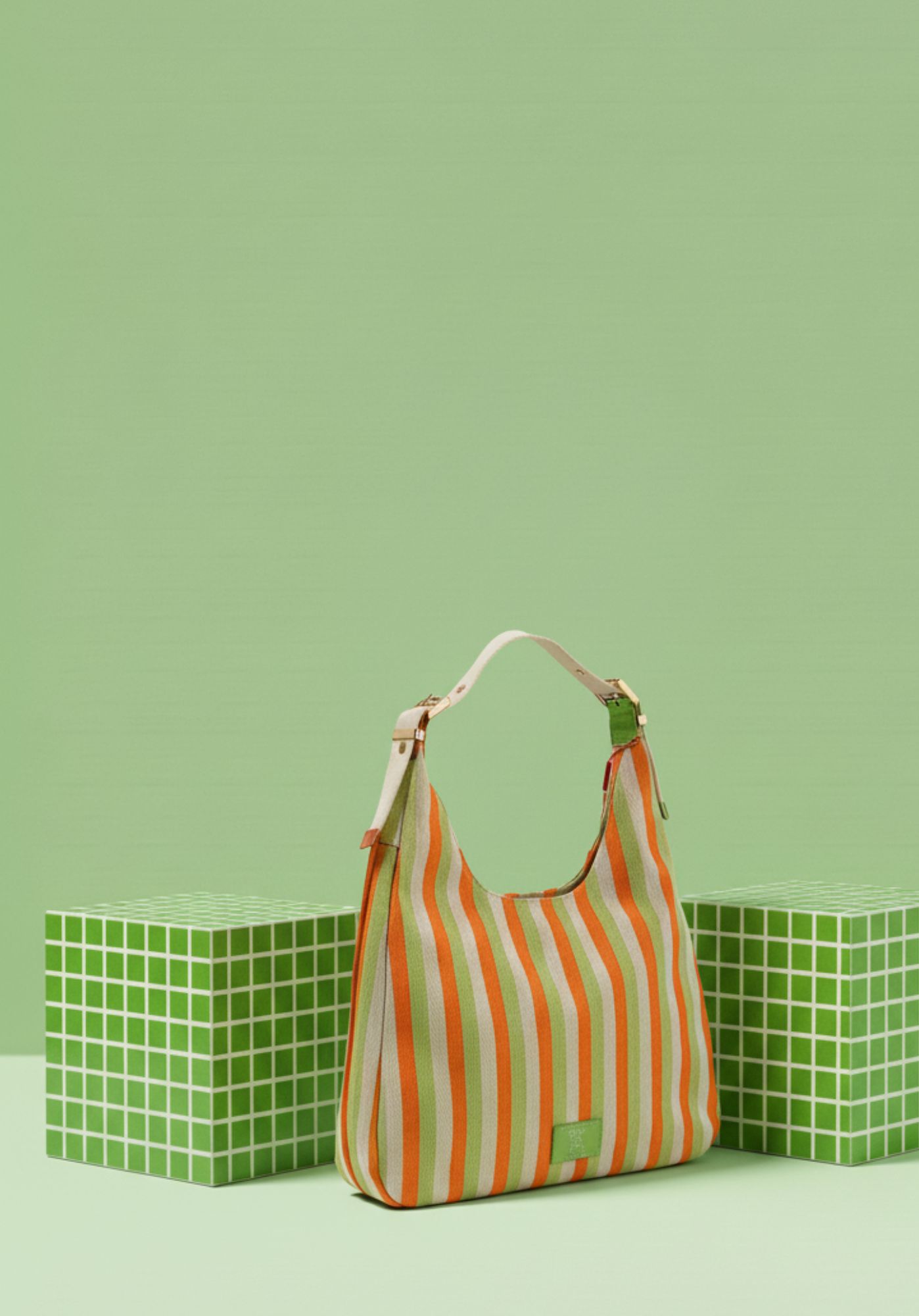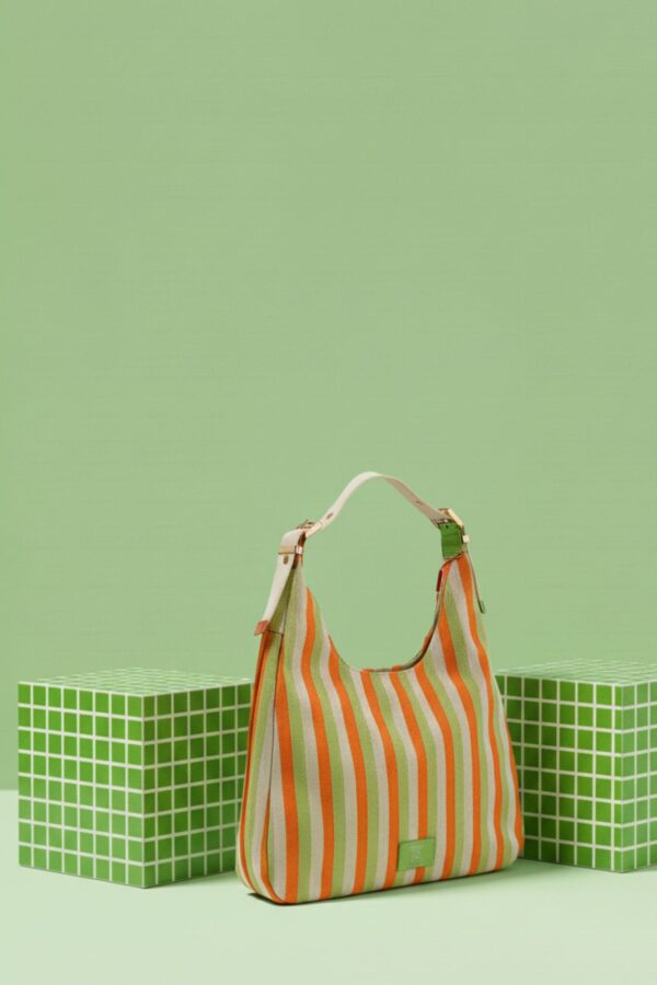 Este bolso hobo forma parte de la colección en lona gruesa de líneas de color, un tejido resistente que combina el verde con tonos vibrantes como naranja o rosa fucsia. Su diseño es amplio, ligero y muy cómodo, perfecto para quienes buscan un bolso práctico con un estilo veraniego y actual.