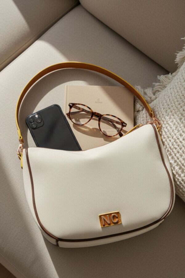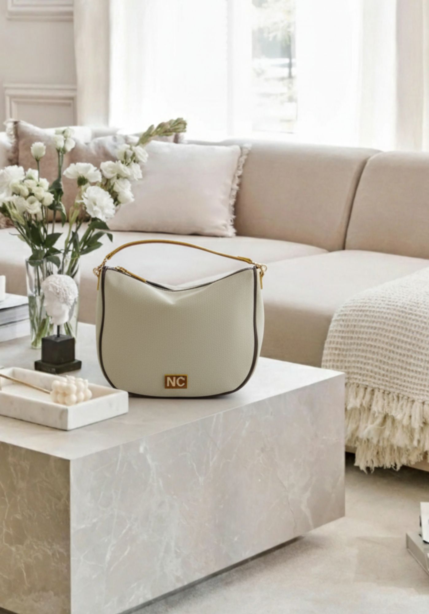 Bolso hobo de lona natural beige, diseñado para mujeres que buscan un bolso ligero, amplio y funcional. Cuenta con cierre superior con cremallera y asa para el hombro, ofreciendo comodidad y facilidad de uso. Su diseño sencillo pero lleno de detalles, junto con el logo NC de NOCO en metal dorado sobre un cuadrito de piel camel con bordes amarillos, aporta estilo y elegancia. Ideal para llevar todo lo necesario sin perder ligereza, perfecto para el día a día, oficina o planes urbanos.