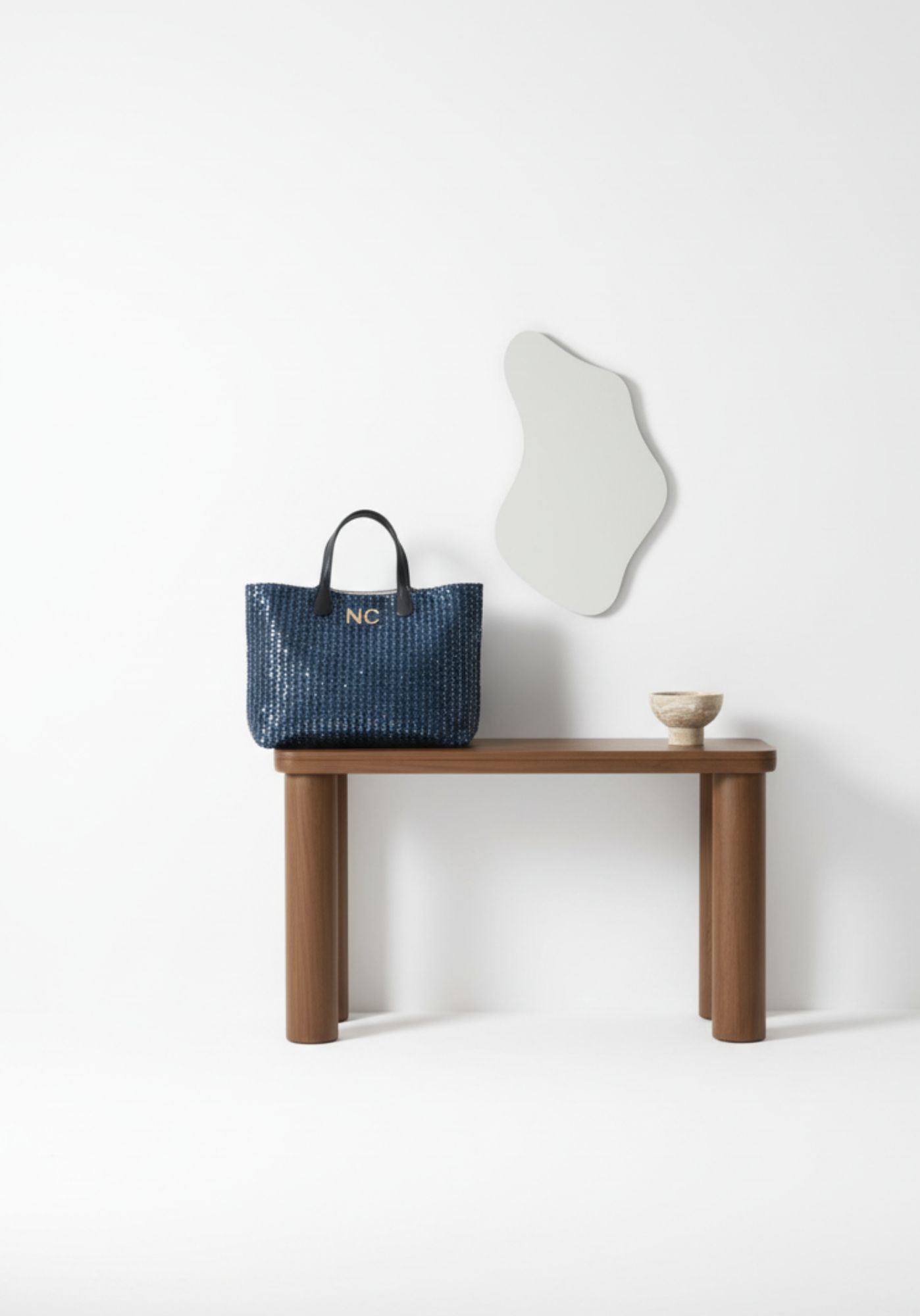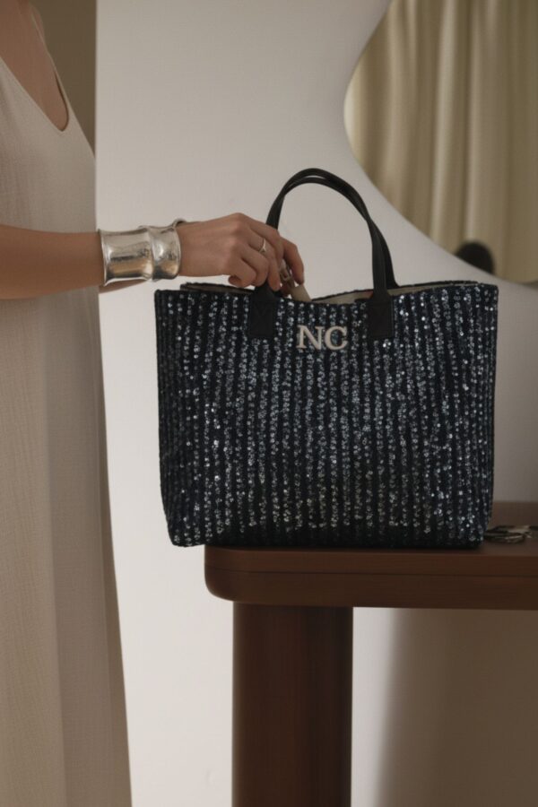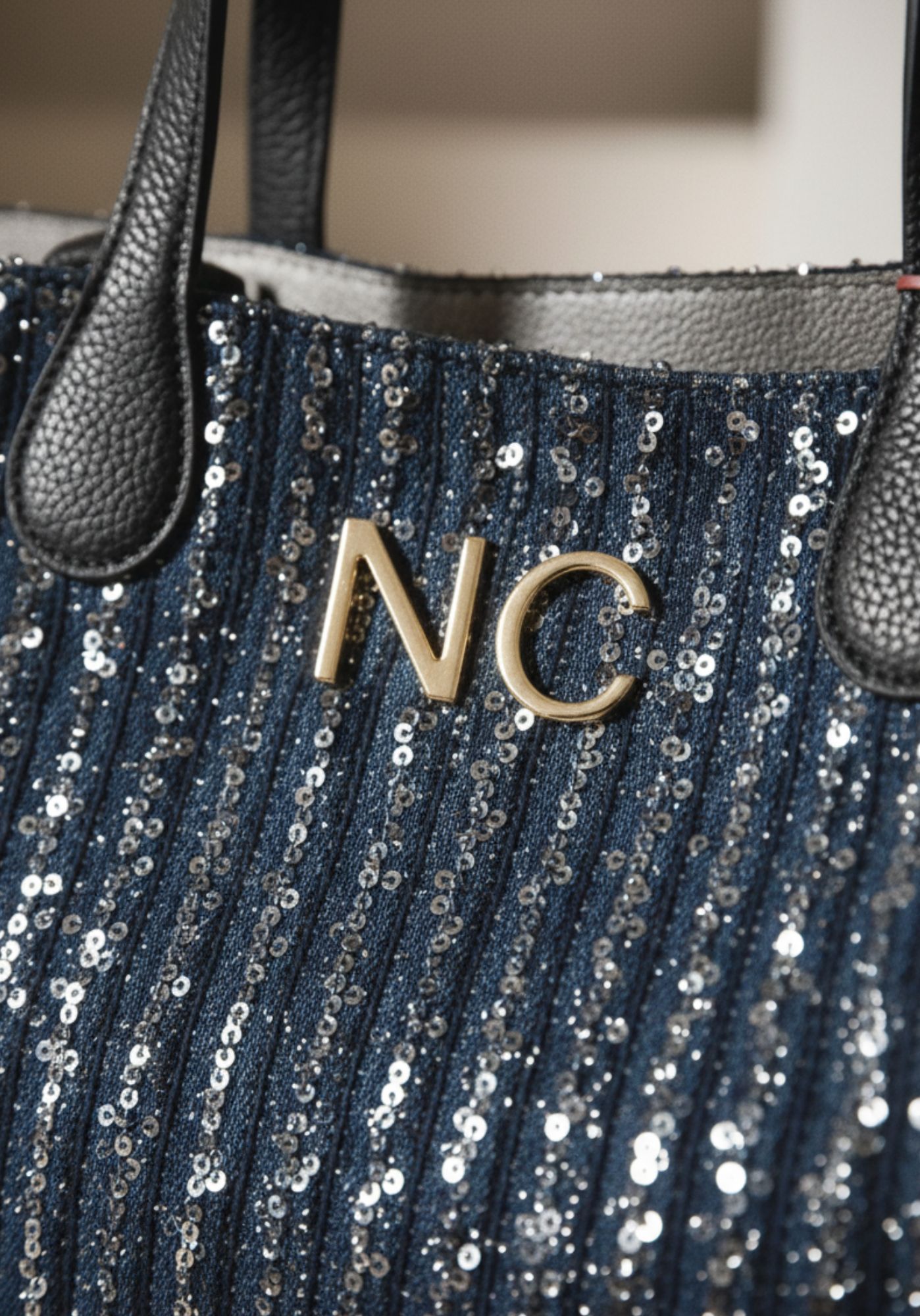 Bolso shopper NOCO diseñado en tejido vaquero denim con incrustaciones cosidas de lentejuelas, un material sofisticado y muy especial que aporta brillo y elegancia sin perder el carácter urbano del denim.