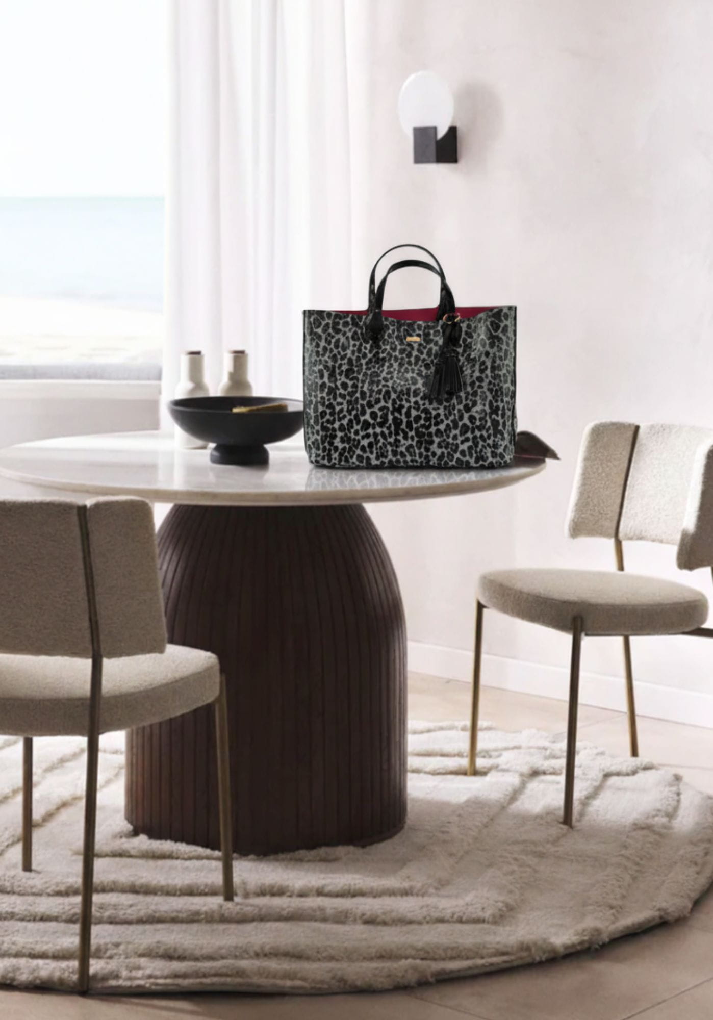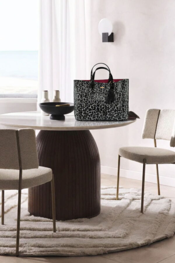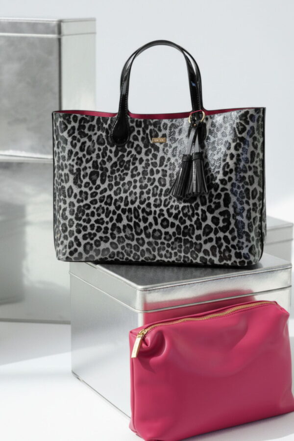 Este bolso shopper grande de Noco es una de las piezas más prácticas y versátiles de la colección diseñada en charol con estampado de leopardo en tonos grises y negros, con detalles en charol negro liso y el inconfundible interior en rosa fucsia, sello distintivo de la línea.