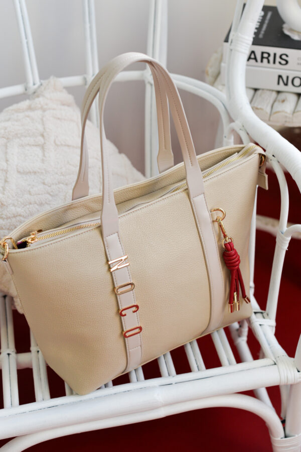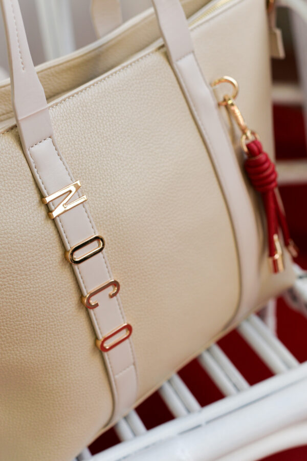 Bolso shopper amplio y funcional diseñado en piel vegana. La tira central con el logo Noco en letras metalizadas doradas aporta un toque sofisticado que eleva su diseño minimalista.