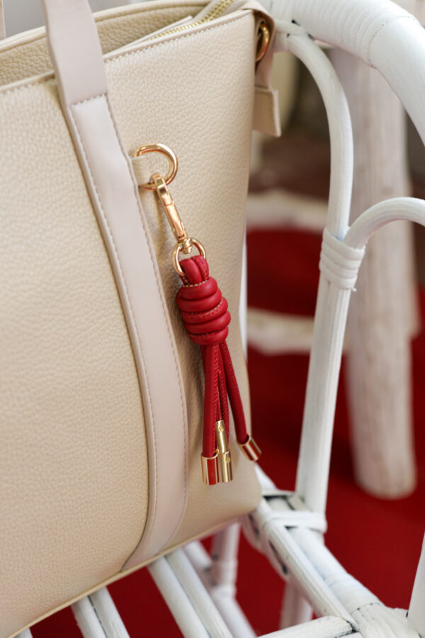 El llavero pompón rojo extraíble añade ese contraste vibrante y divertido que se puede usar también por separado, sumando versatilidad y alegría a tu look.
