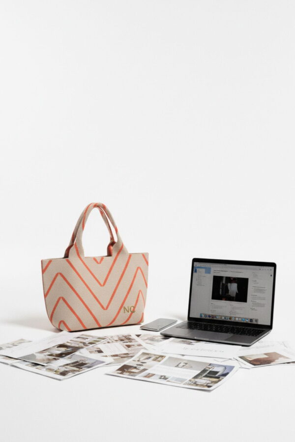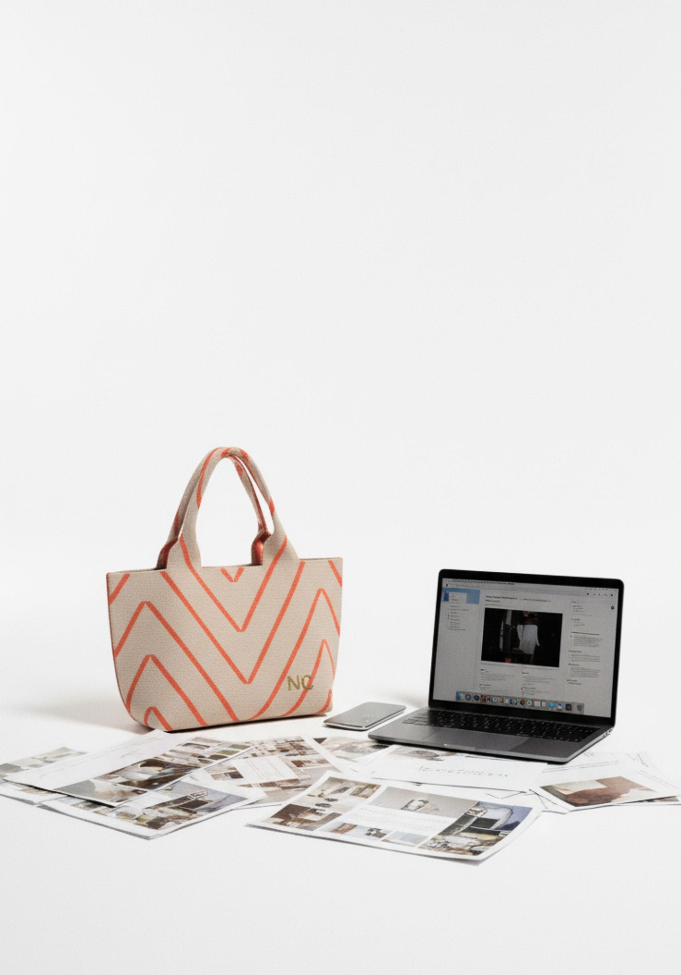 Este bolso shopper de Noco, confeccionado en punto estructurado, combina diseño contemporáneo y funcionalidad en un modelo amplio y elegante. Su estampado de líneas diagonales a contraste sobre base en blanco roto aporta un aire moderno y veraniego, ideal para mujeres que buscan un bolso estiloso y versátil.