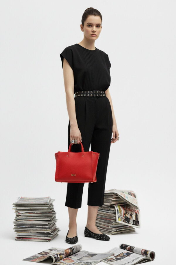 Cuenta con cremallera superior, que garantiza seguridad para tus objetos personales, y un bolsillo trasero con cremallera para mantener organizadas tus pertenencias más importantes. Los pespuntes de hilo y las pequeñas tachuelas redondas aportan detalles discretos que realzan el diseño sin recargarlo.