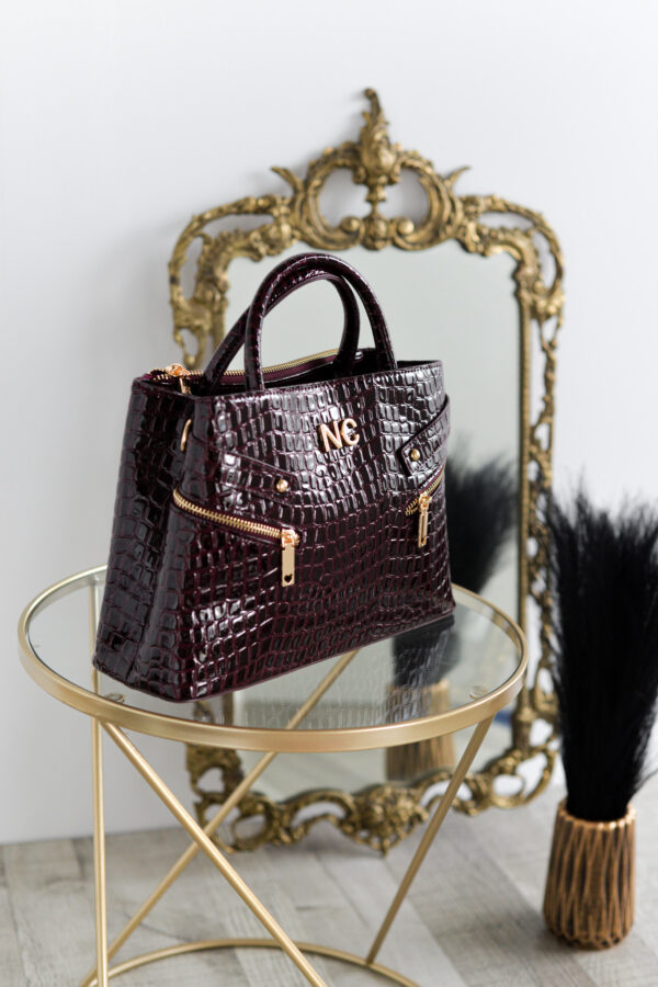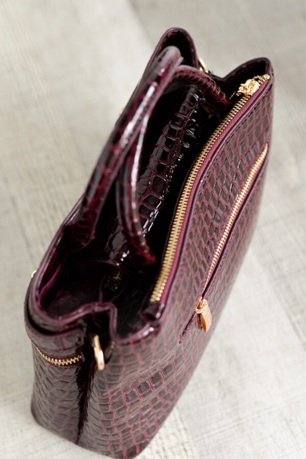- Bolso de mano en charol de cocodrilo con textura rígida