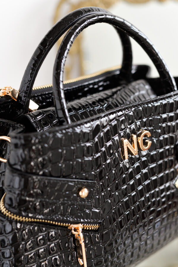 Este bolso de mano clásico está confeccionado en charol con textura de cocodrilo, ofreciendo una estructura rígida que mantiene su forma y estilo impecable.