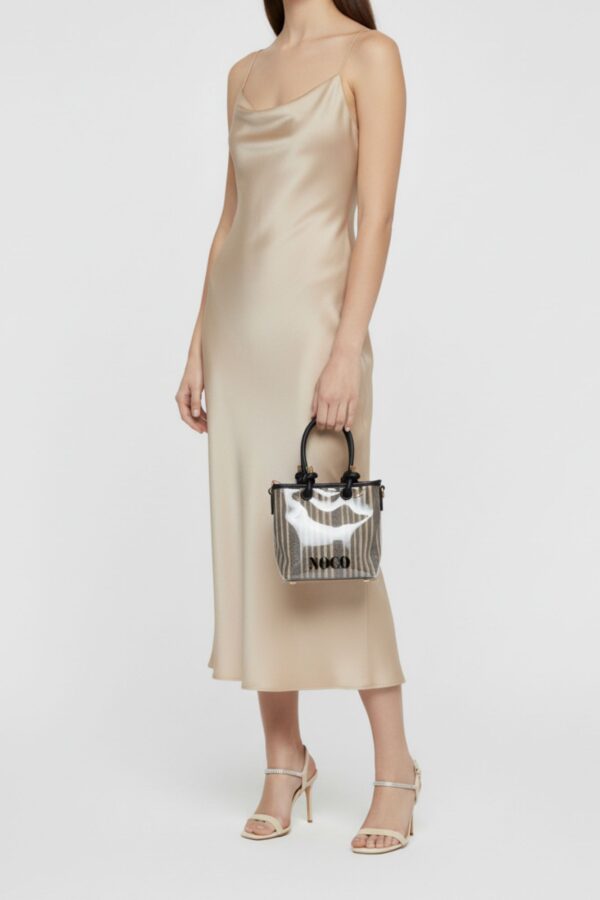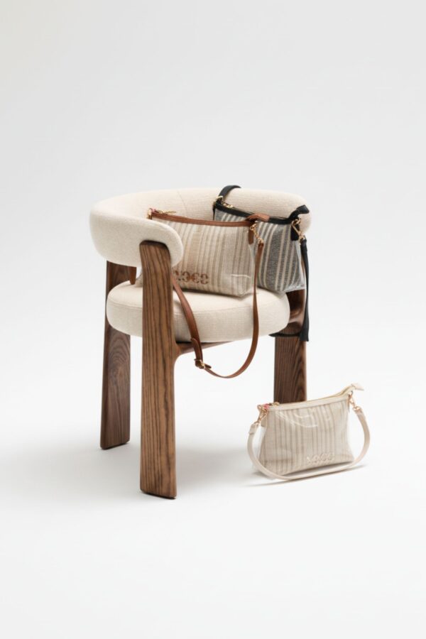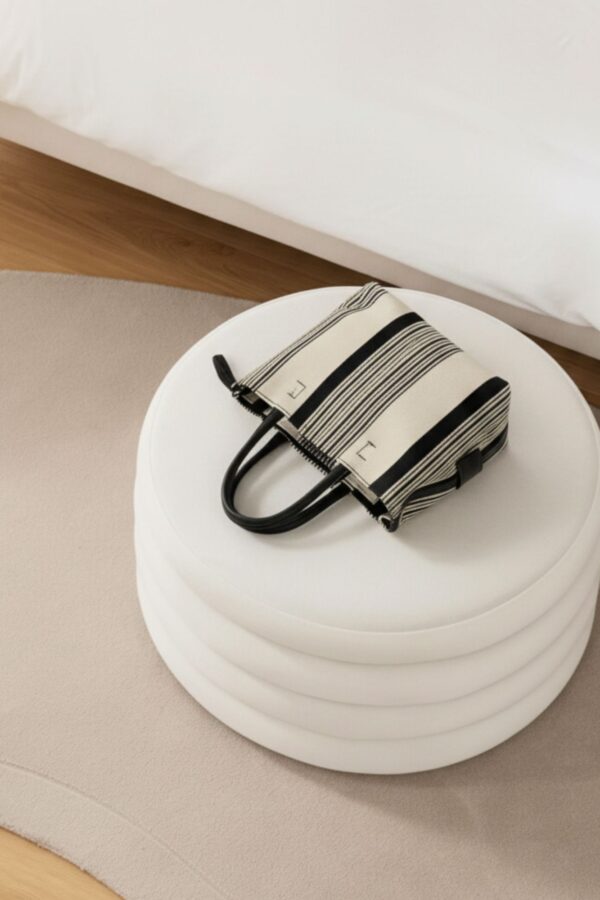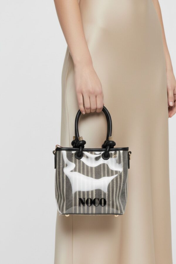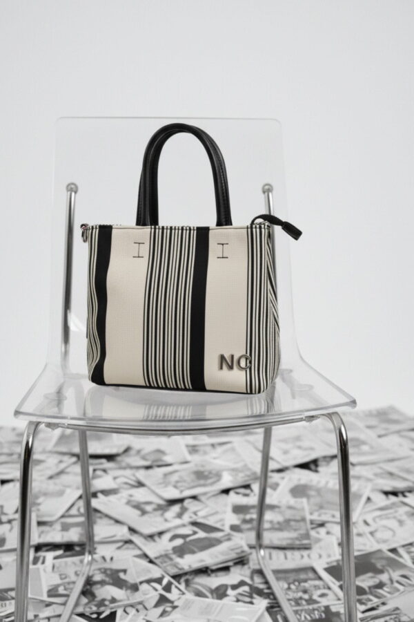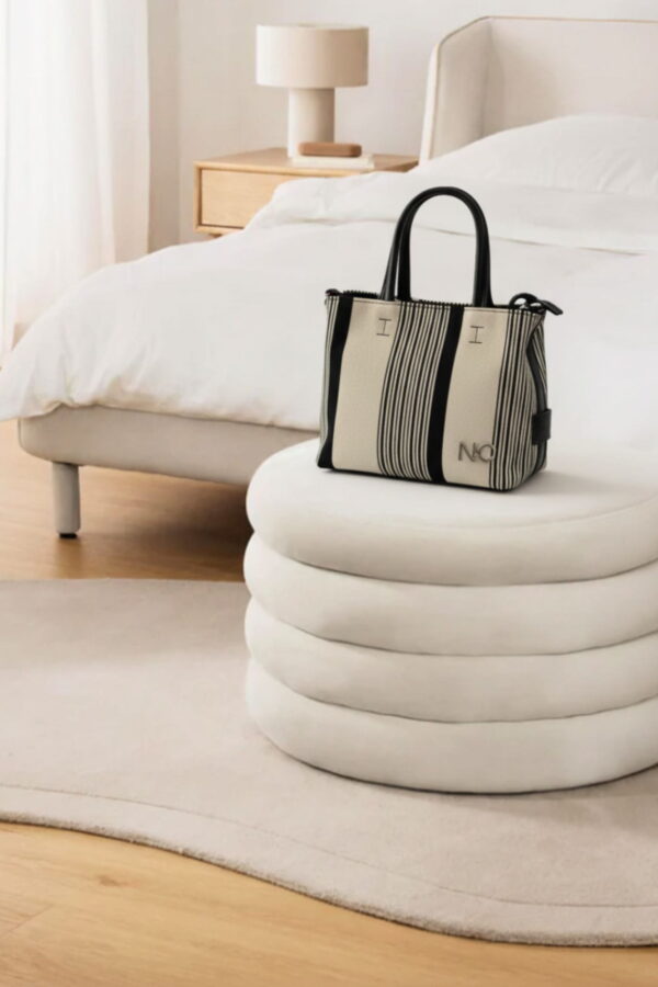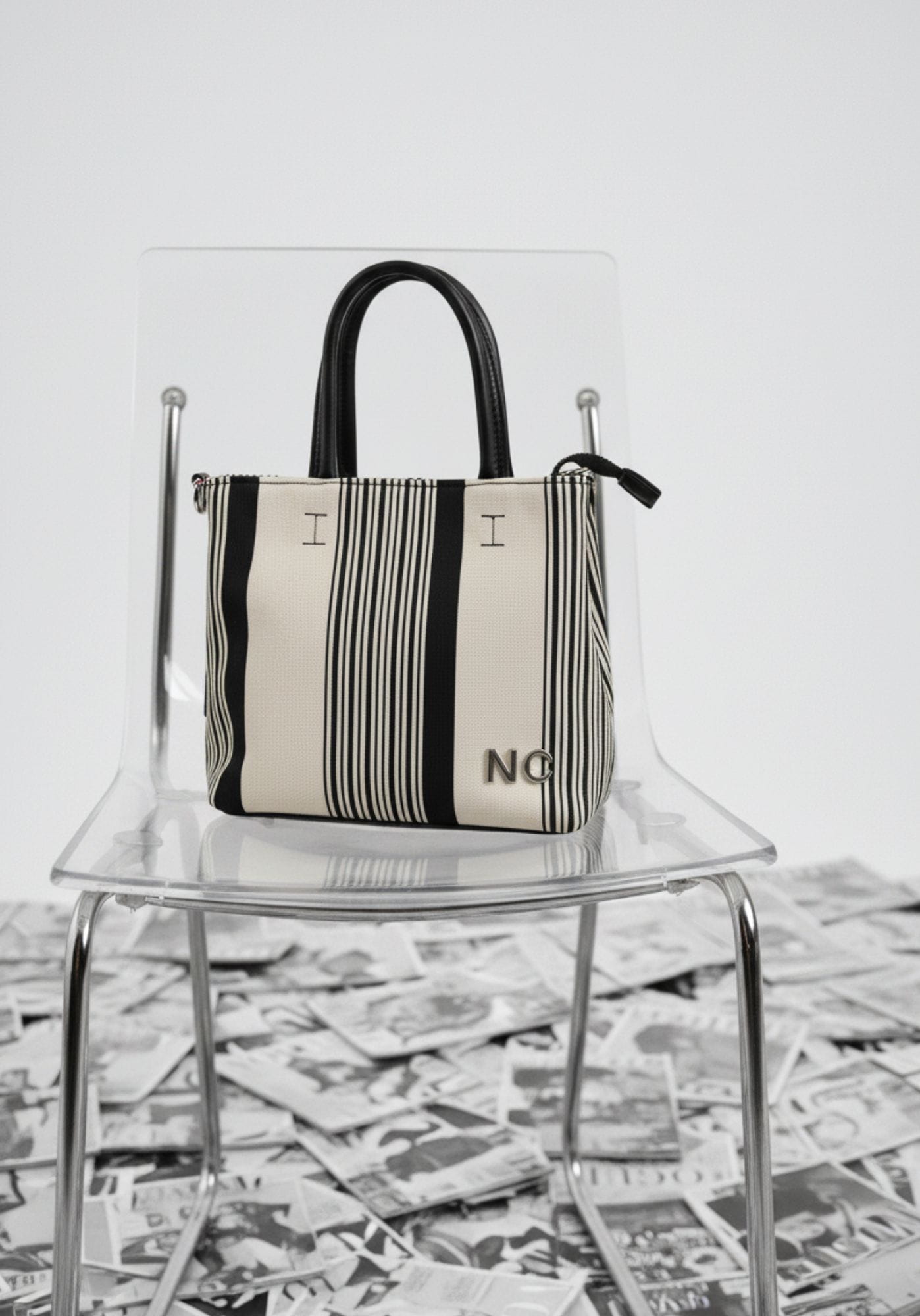 Este bolso tote mediano de Noco forma parte de una colección única diseñada en punto estampado grueso, con un elegante patrón de líneas en negro sobre base en tono crema. Un diseño con mucha personalidad que combina textura, contraste y estilo contemporáneo, perfecto para elevar cualquier look diario.