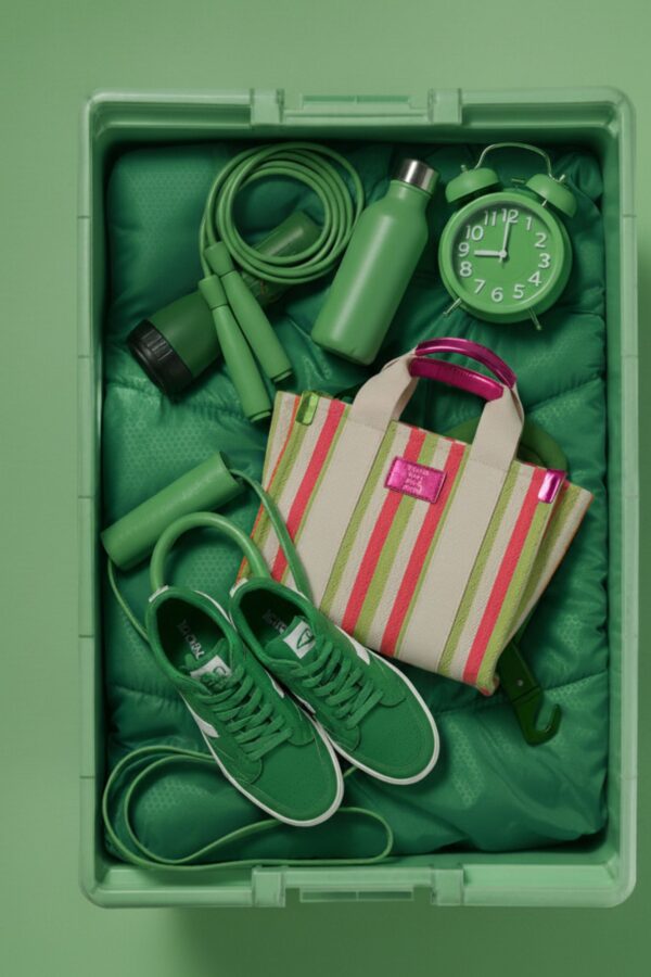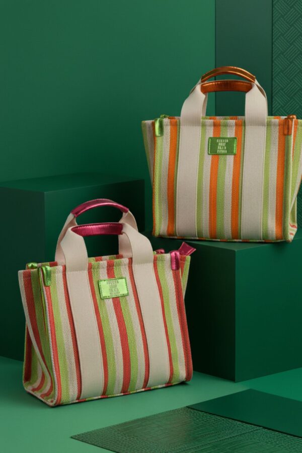 Este bolso tipo tote está diseñado en una lona gruesa de líneas de color, un tejido resistente y con un aire fresco perfecto para la temporada. La colección combina siempre el verde con tonos vivos como naranja o rosa fucsia, creando un contraste vibrante y muy identificable.