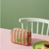 Este bolso tipo tote está diseñado en una lona gruesa de líneas de color, un tejido resistente y con un aire fresco perfecto para la temporada. La colección combina siempre el verde con tonos vivos como naranja o rosa fucsia, creando un contraste vibrante y muy identificable.