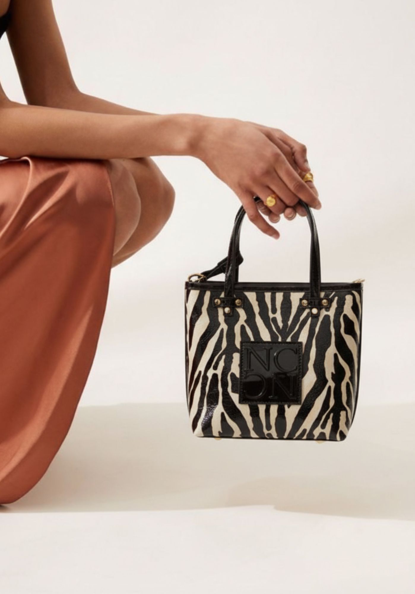 Este bolso tote mini de Noco pertenece a la colección más atrevida de la marca, diseñada en charol con estampado de cebra en tonos negro y crema, combinada con detalles en piel vegana negra. El logo de Noco con las iniciales grabadas en el frontal aporta identidad y un acabado sofisticado.