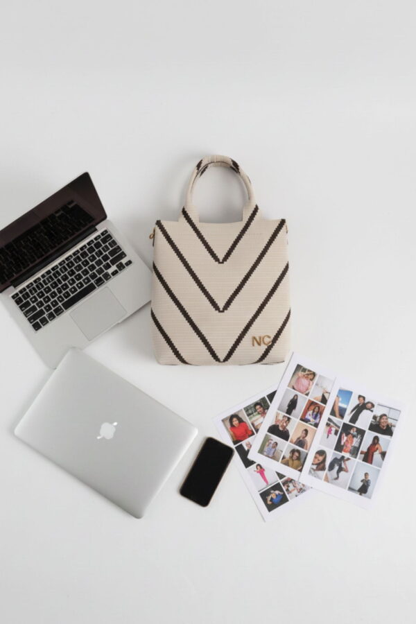 Este bolso tote tipo cubo de Noco, confeccionado en punto estructurado, combina un diseño moderno y funcional con un estilo urbano y versátil. Su estampado de líneas diagonales a contraste sobre base en blanco roto aporta frescura y personalidad, mientras que su tamaño mediano lo hace perfecto para el día a día sin resultar voluminoso.