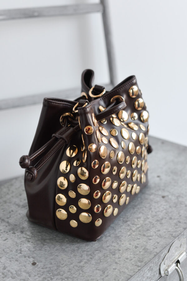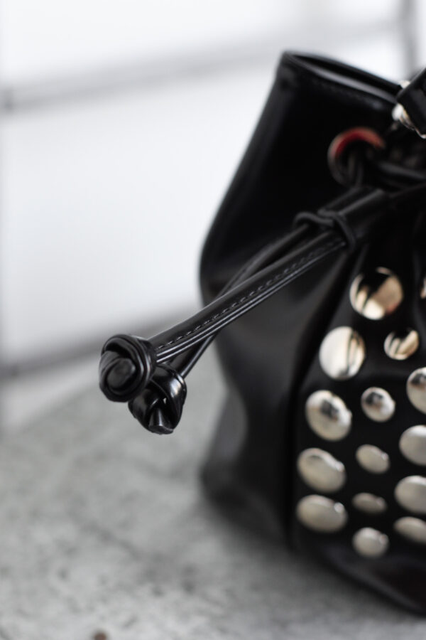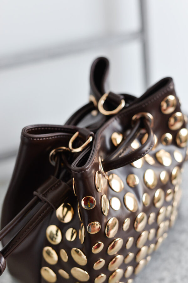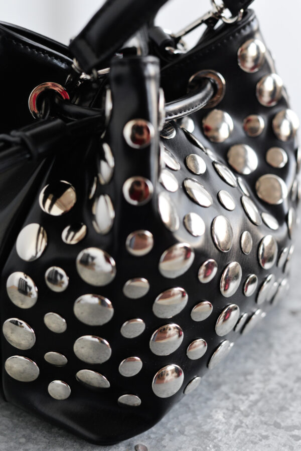 Bombonera pequeña en piel sintética gruesa destaca por sus tachuelas grandes que le dan un aire atrevido y contemporáneo.