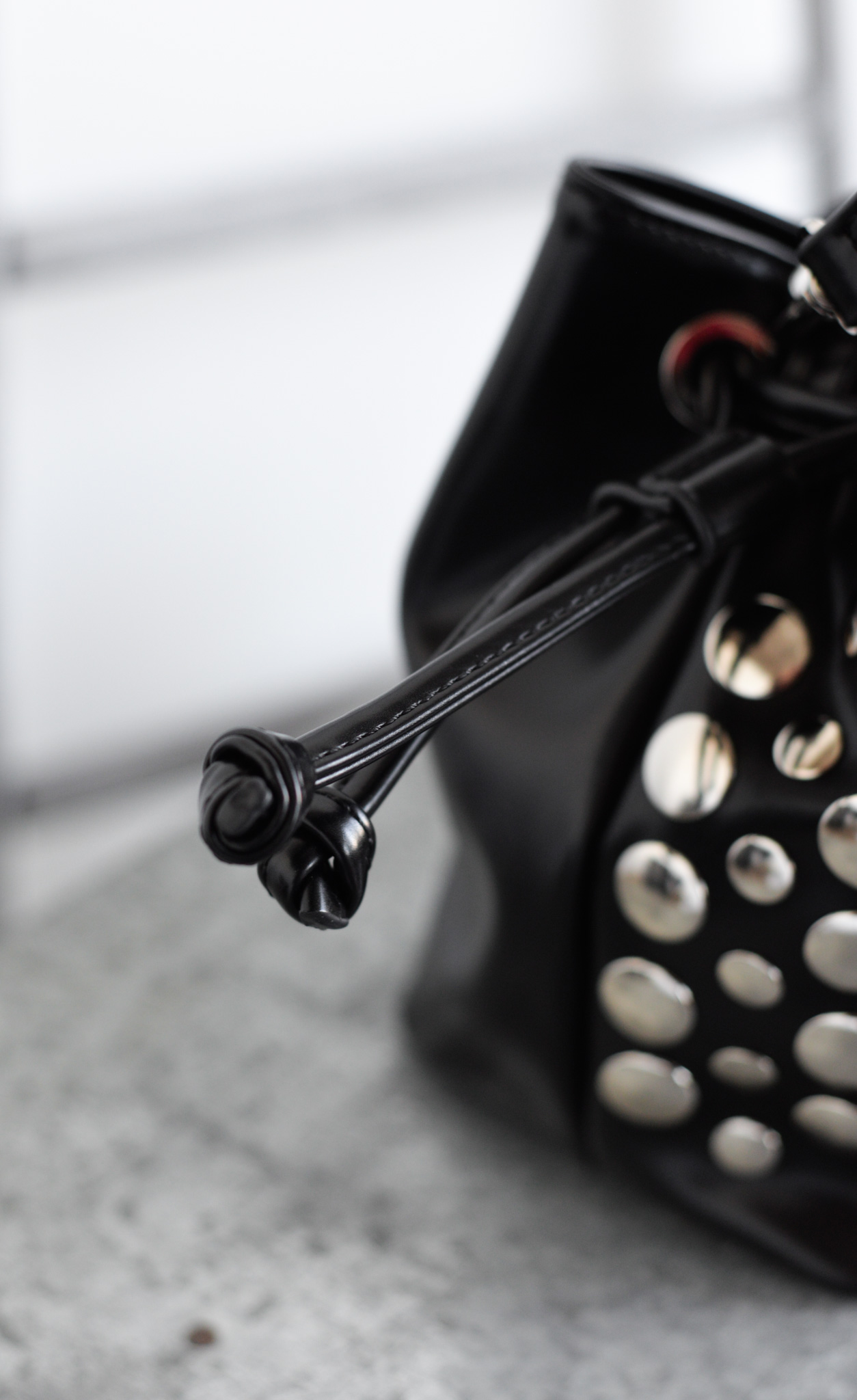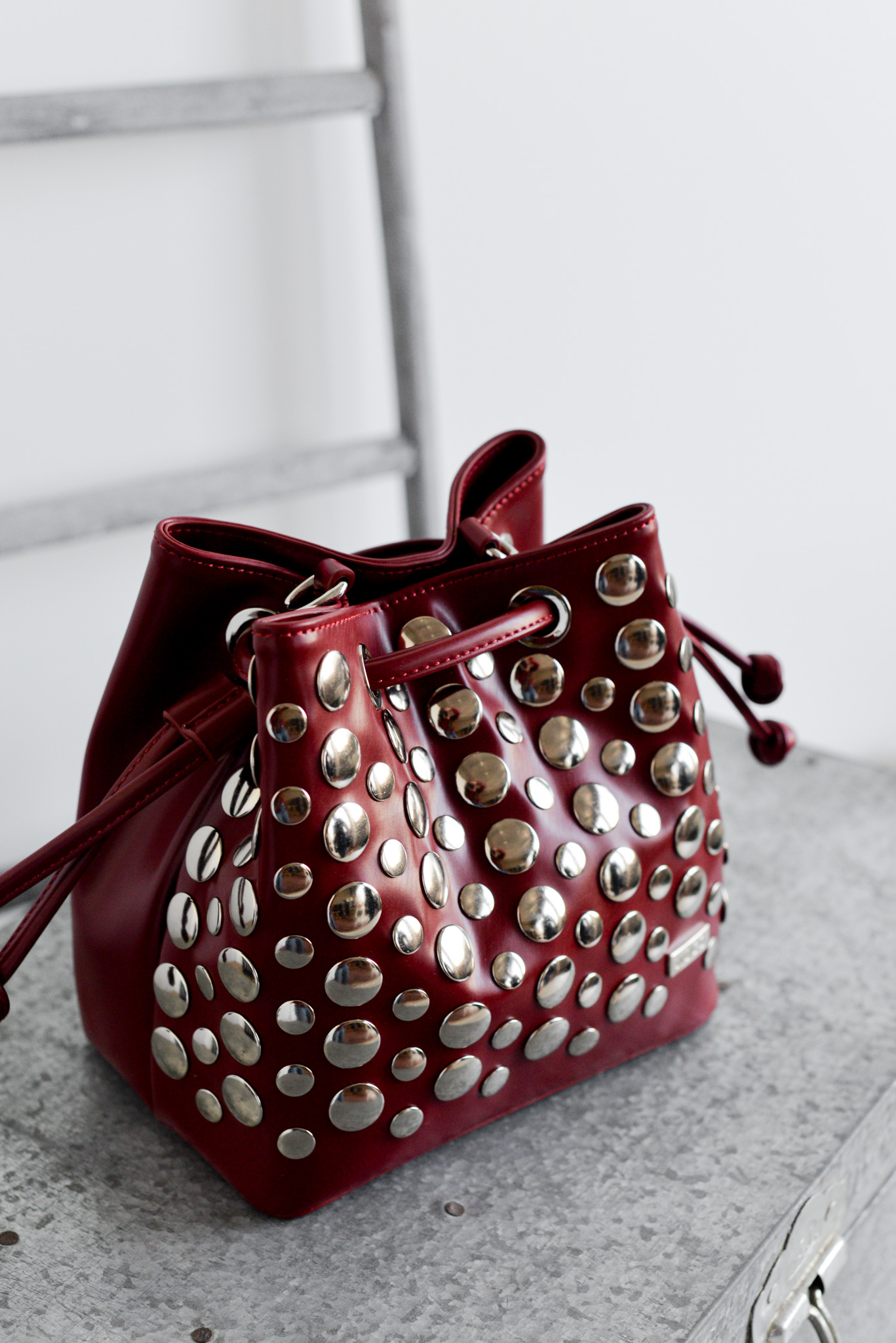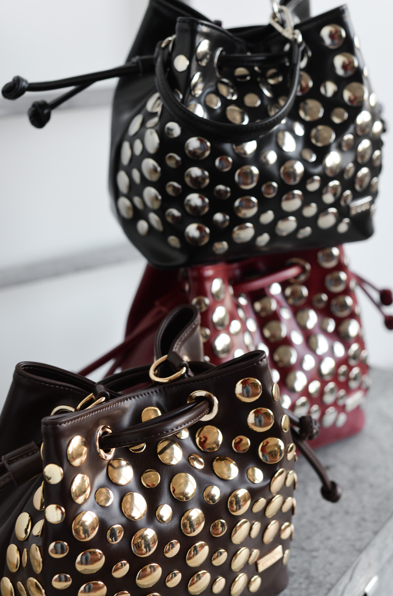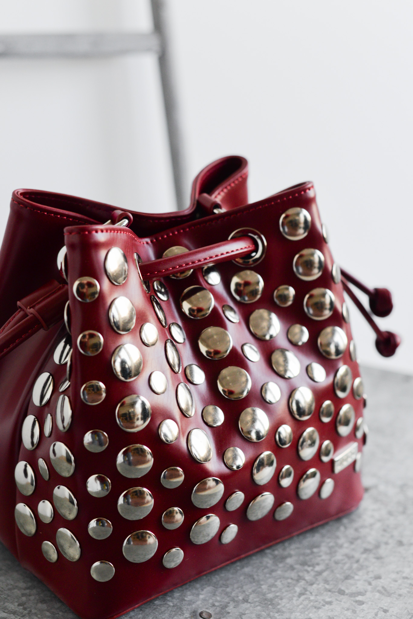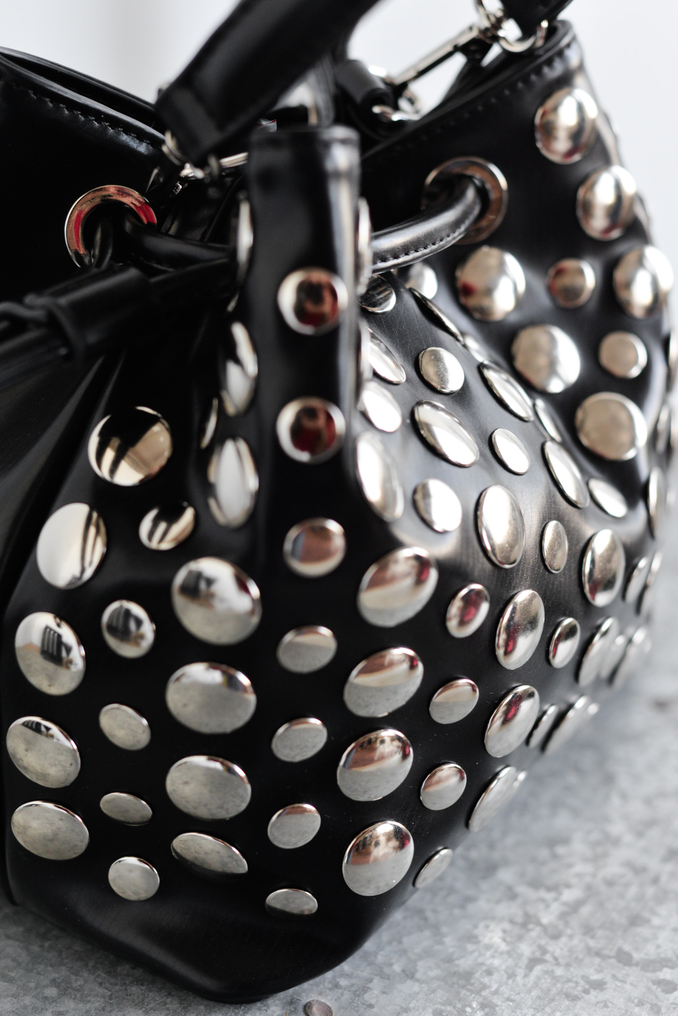 Bombonera pequeña en piel sintética gruesa destaca por sus tachuelas grandes que le dan un aire atrevido y contemporáneo.