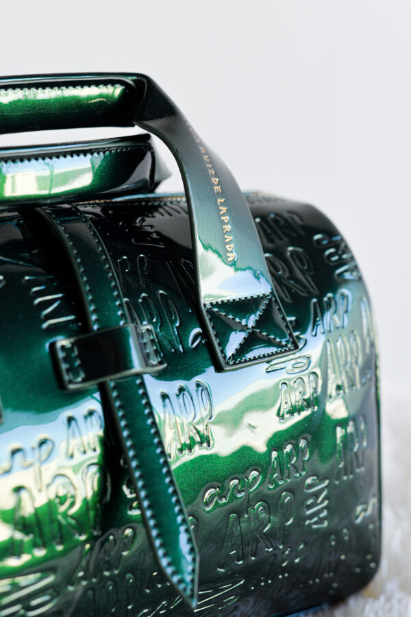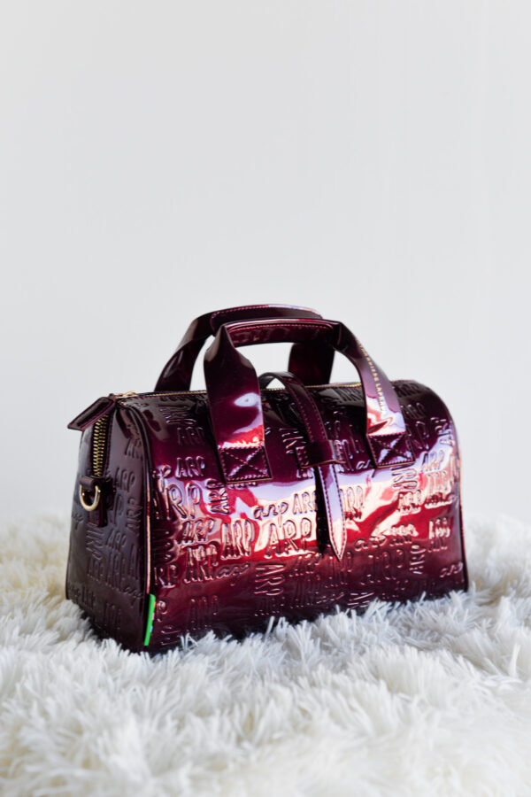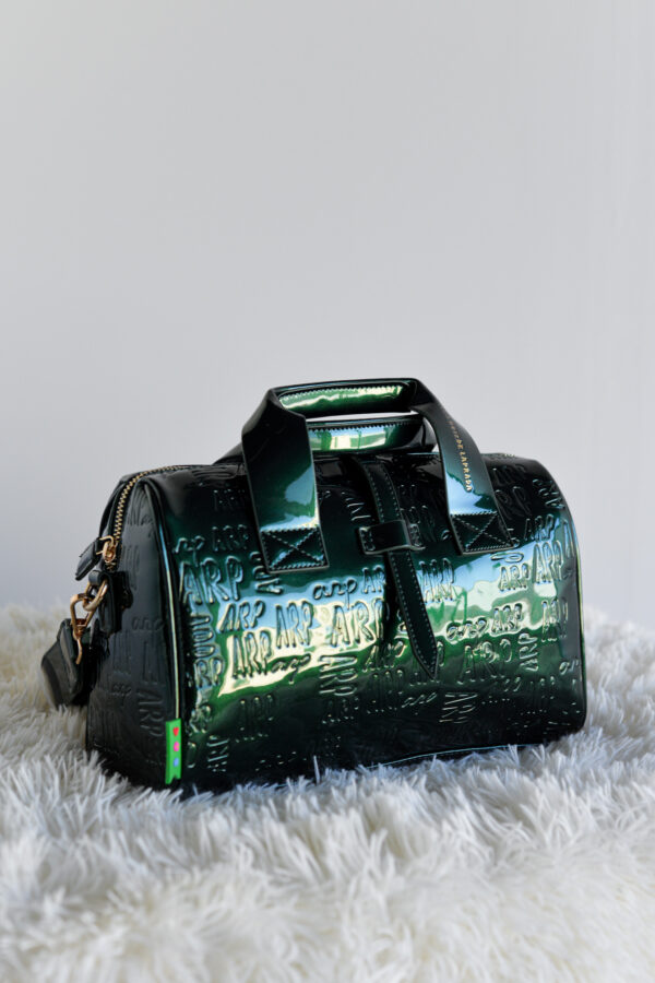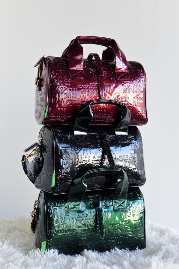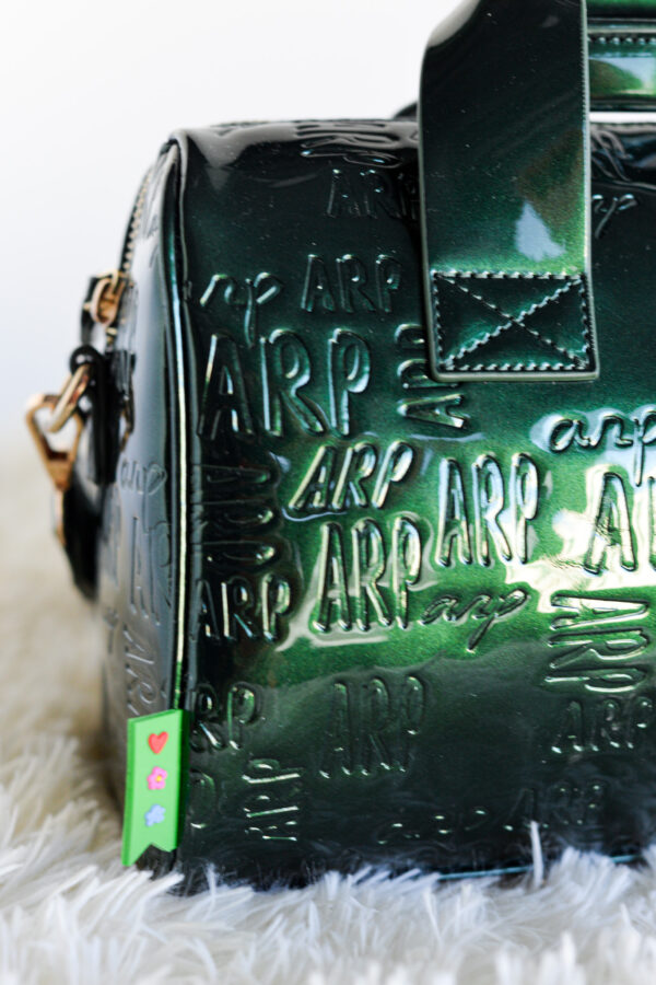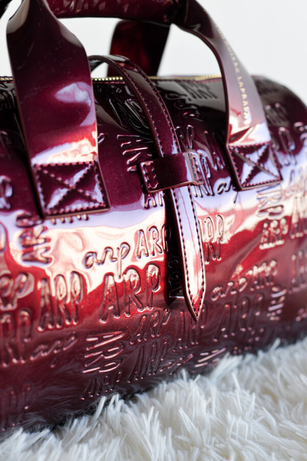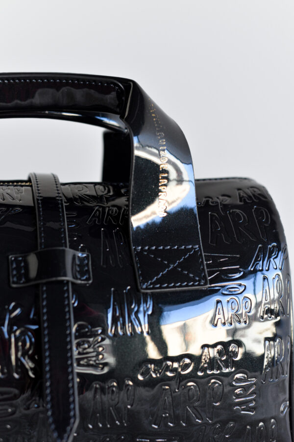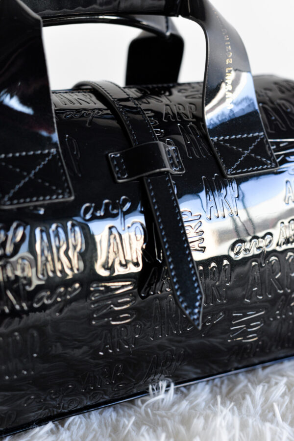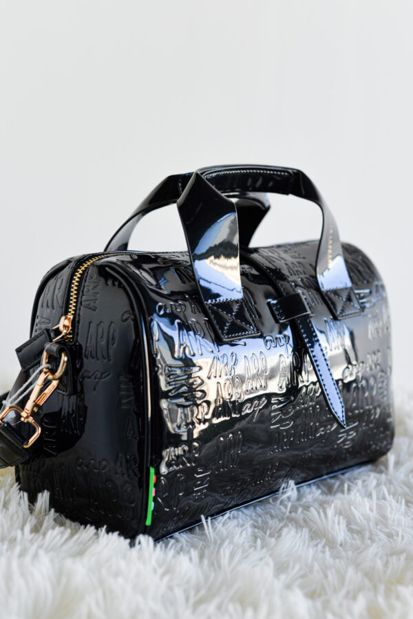 Fabricado en charol estructurado con el logo ARP grabado, combina textura y brillo en un diseño cómodo y funcional. Su cremallera superior garantiza seguridad, y la correa incluida te permite llevarlo al hombro o cruzado según lo necesites.