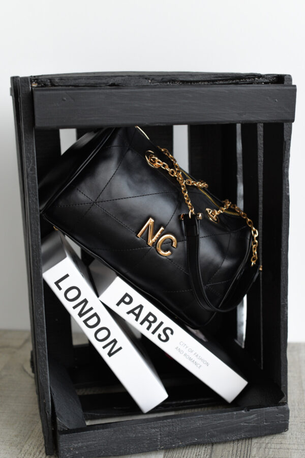 Este bolso bowling de la colección combina la suavidad de la piel vegana lisa con unas asas de cadena dorada más largas de lo habitual, pensadas para llevarlo cómodamente al hombro.