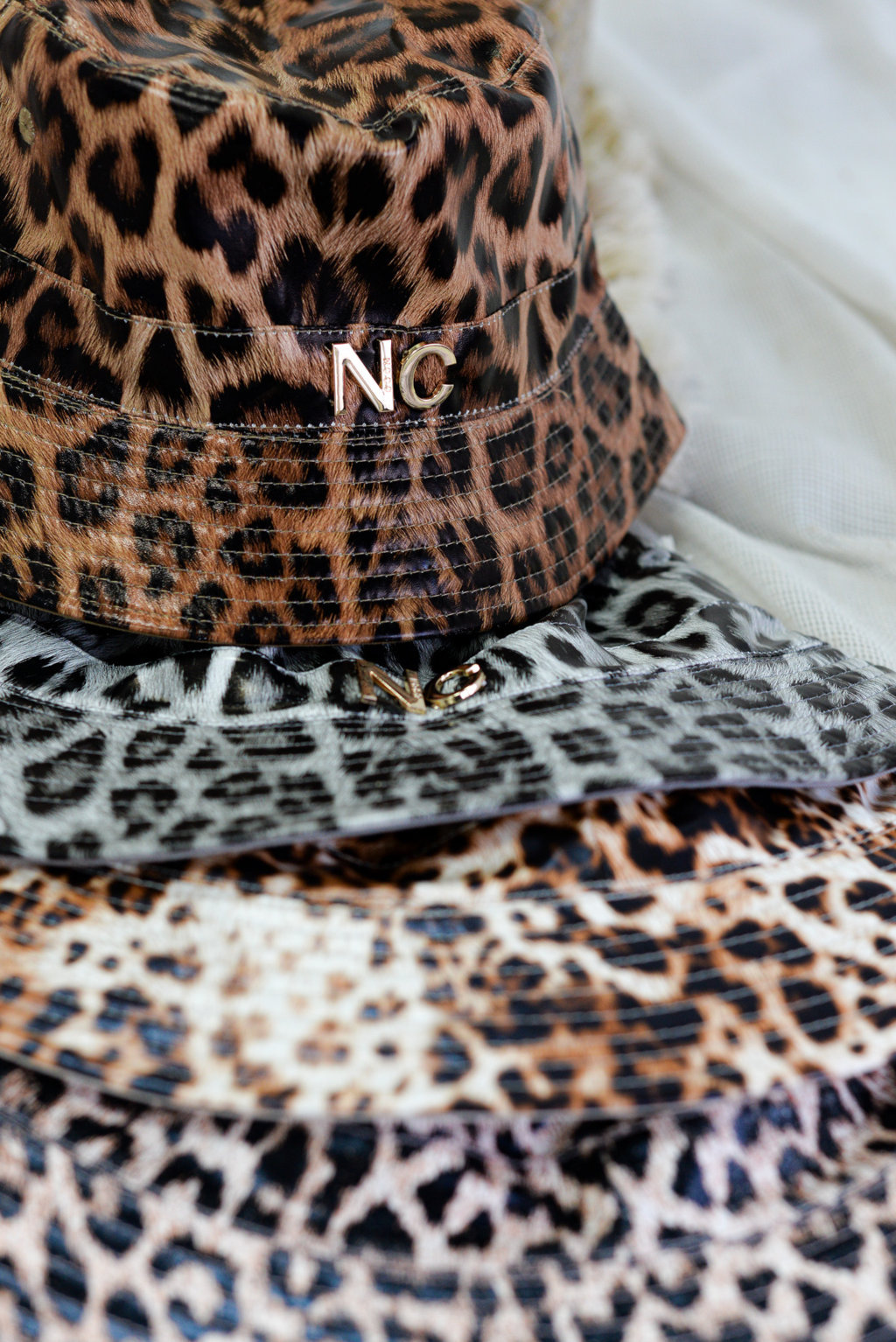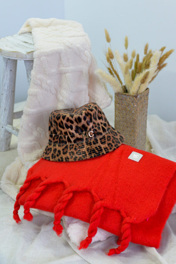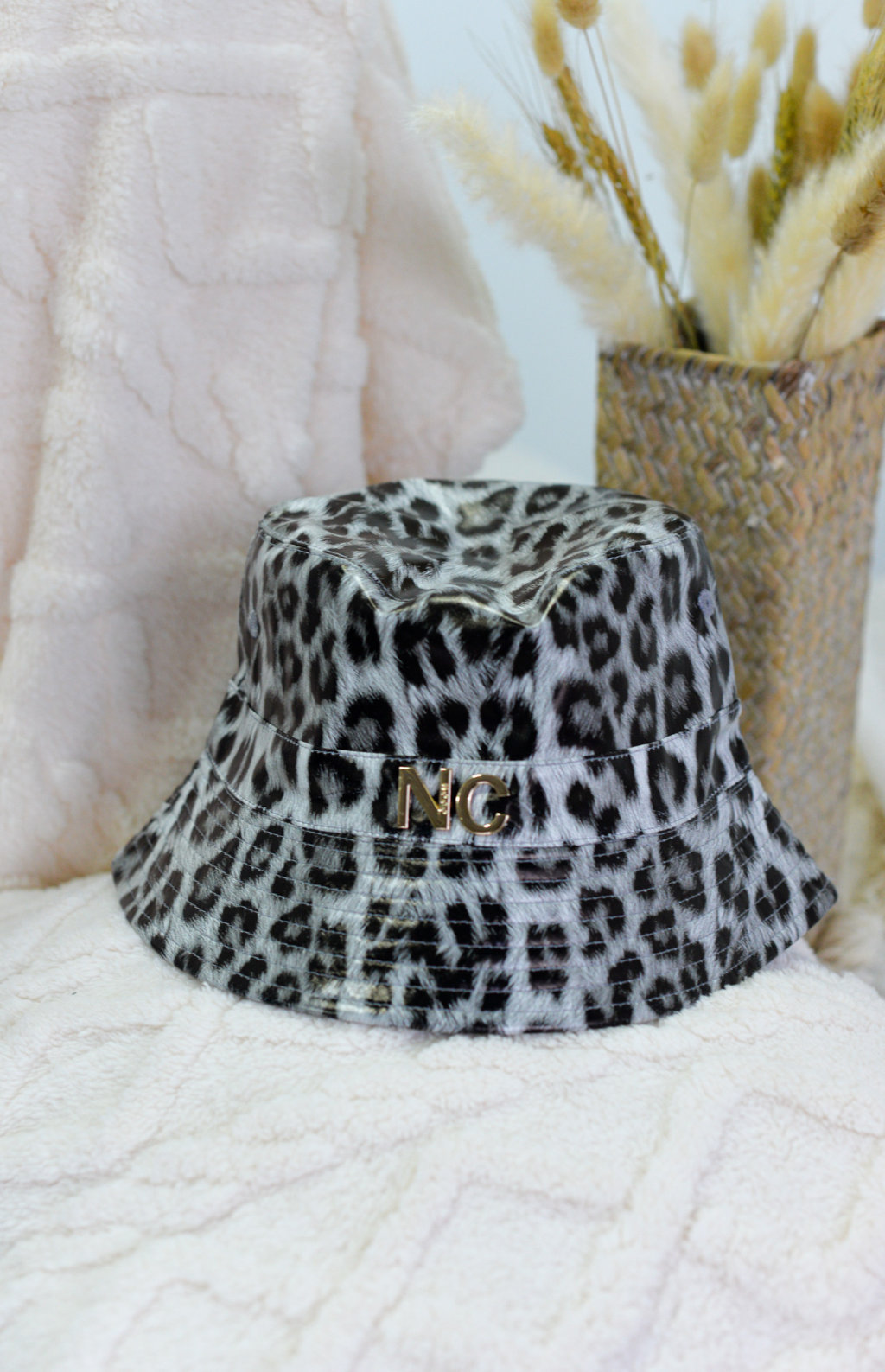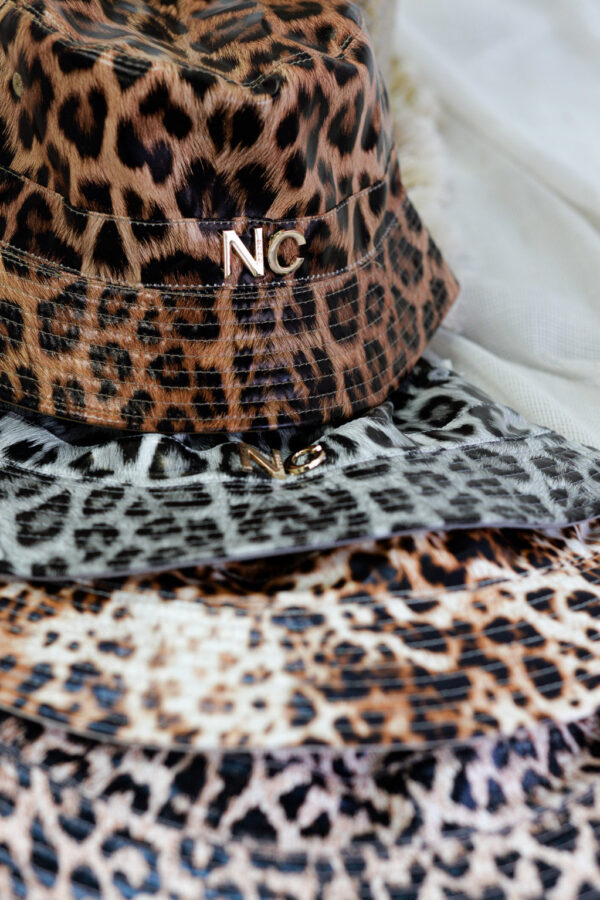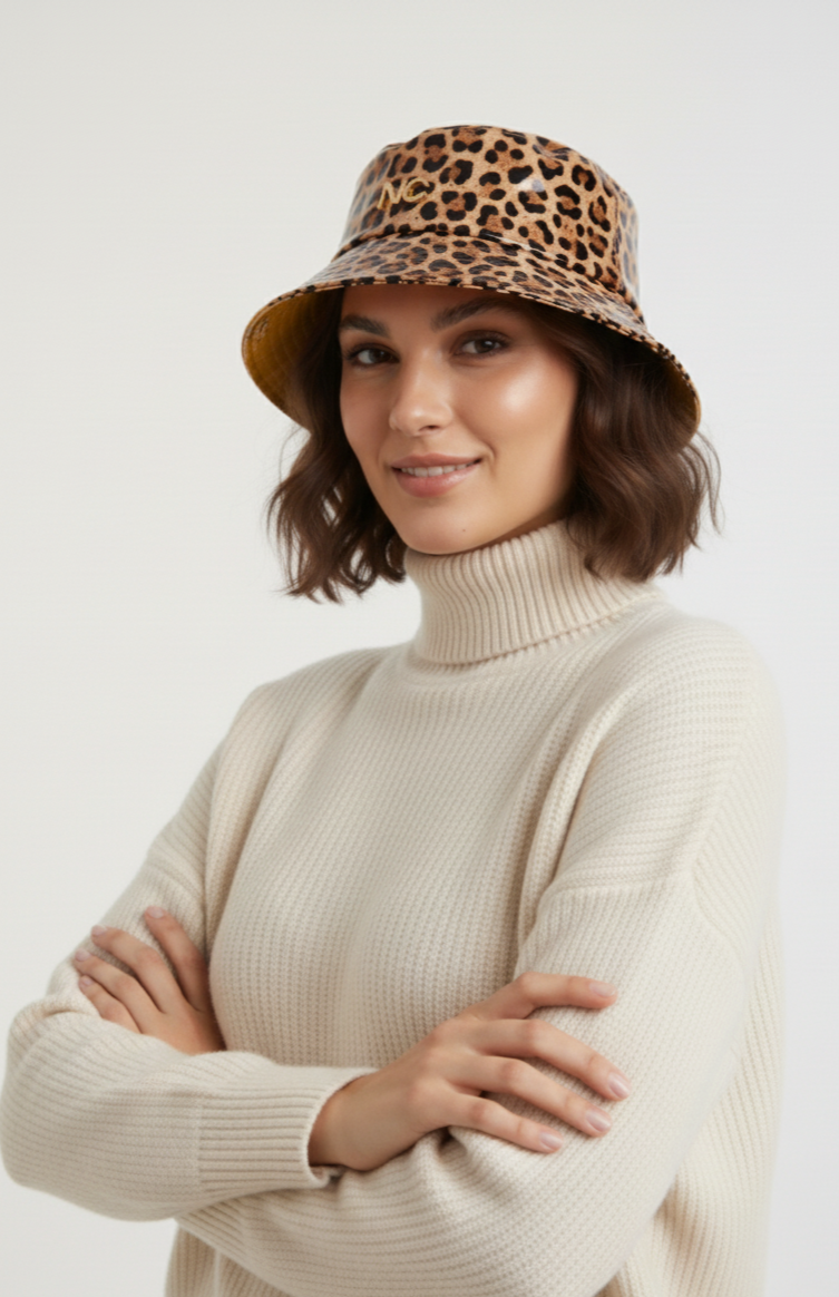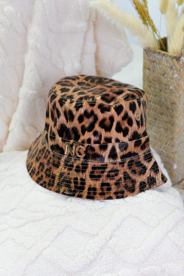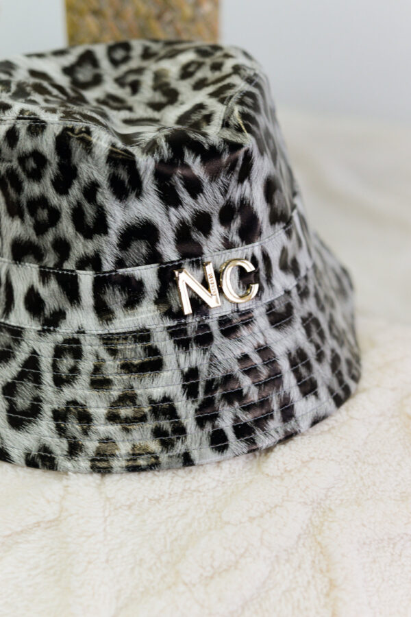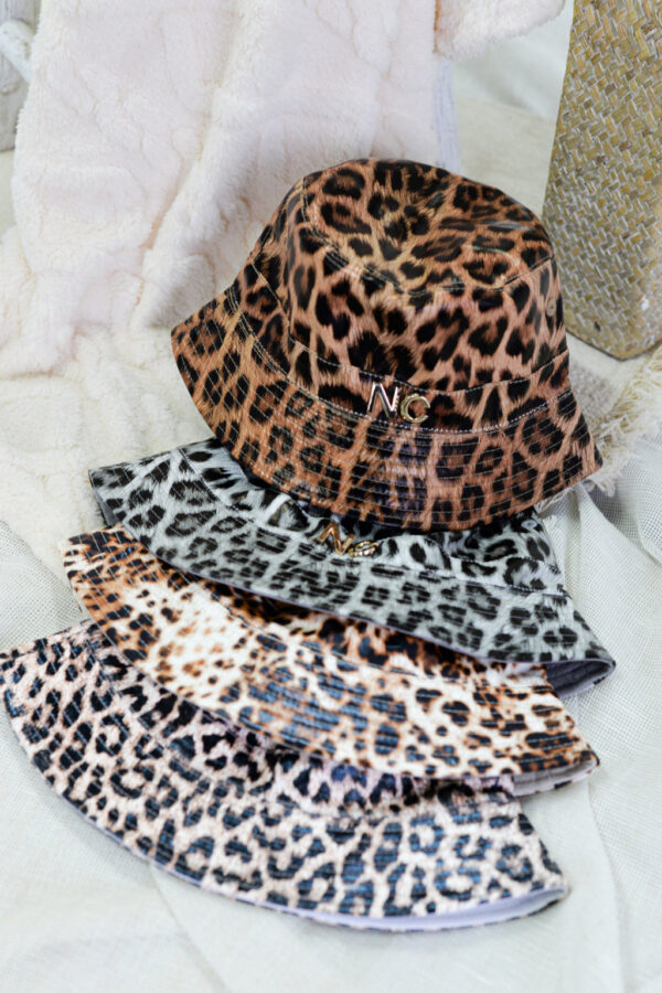 Gorro de formato bucket diseñado en piel sintética de estampados de animal print.