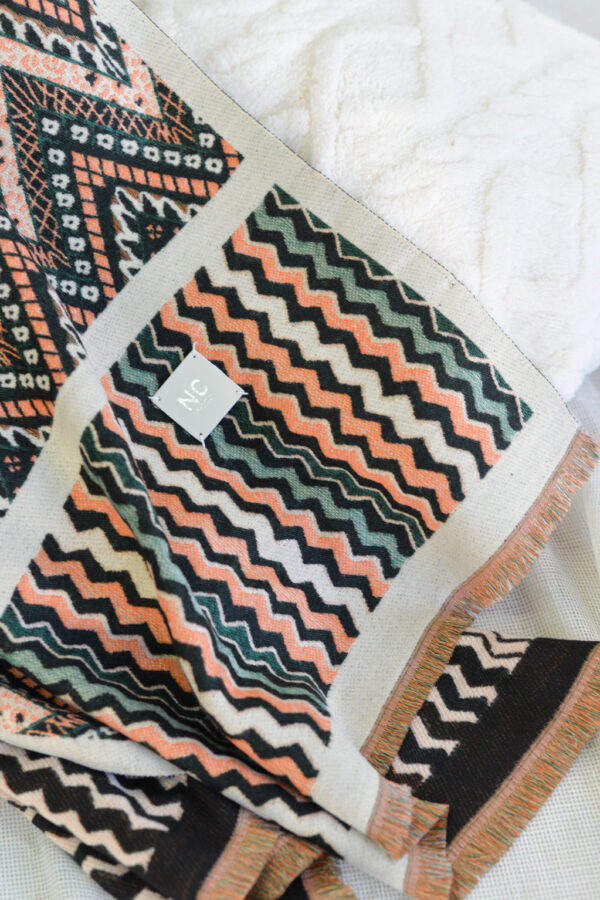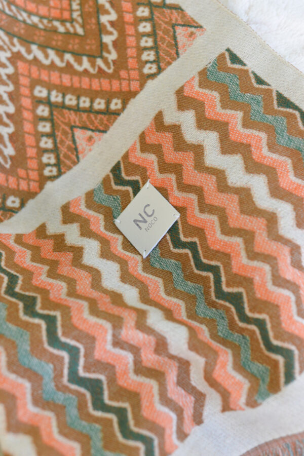 Una bufanda pensada para dar color y estilo al invierno. Su estampado de líneas en zigzag combina distintos tonos que aportan viveza y permiten crear looks variados sin esfuerzo. El tejido tiene un buen gramaje, agradable al tacto y con cuerpo, ideal para mantenerte abrigada sin resultar pesada.