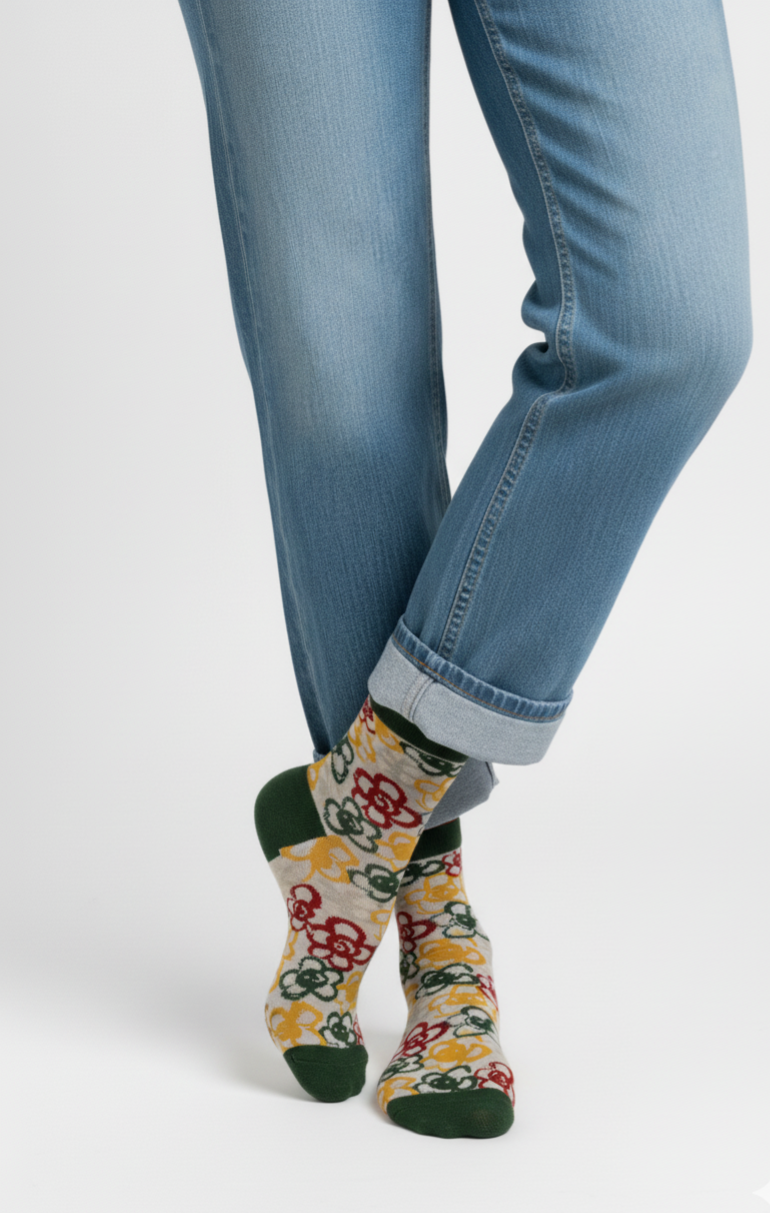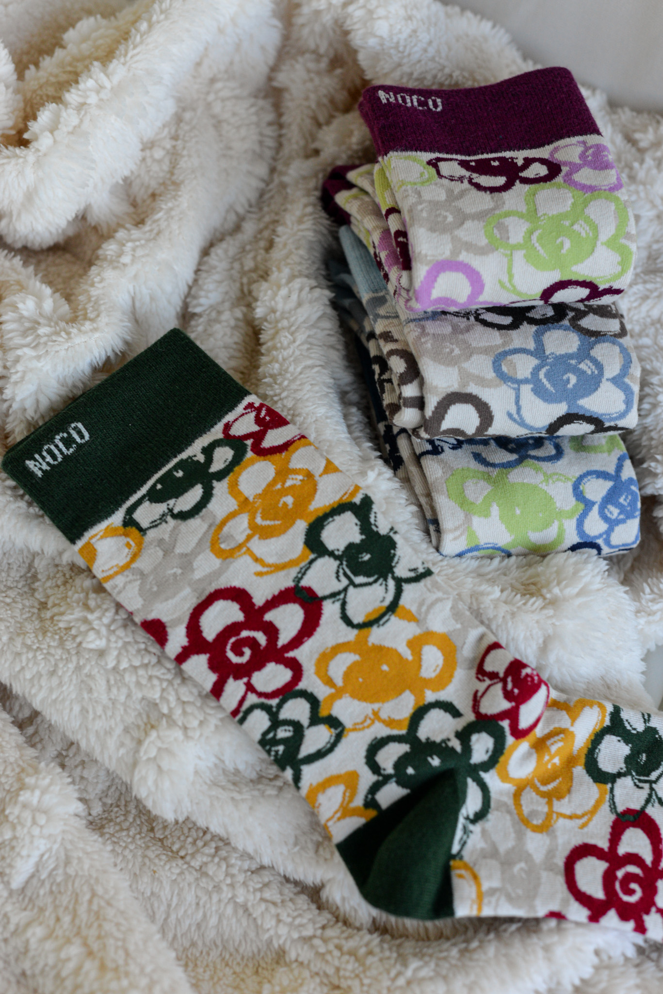 Dale un paso adelante a tu look con los calcetines NOCO, diseñados para quienes buscan estilo sin renunciar al confort. Con estampados originales y detalles en color liso en la puntera, talón y goma superior, estos calcetines unisex combinan diseño moderno con funcionalidad. Estampado de flores estilo grafitti.