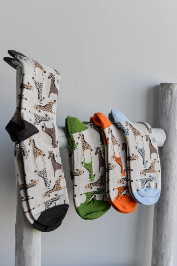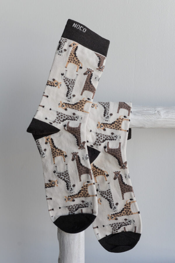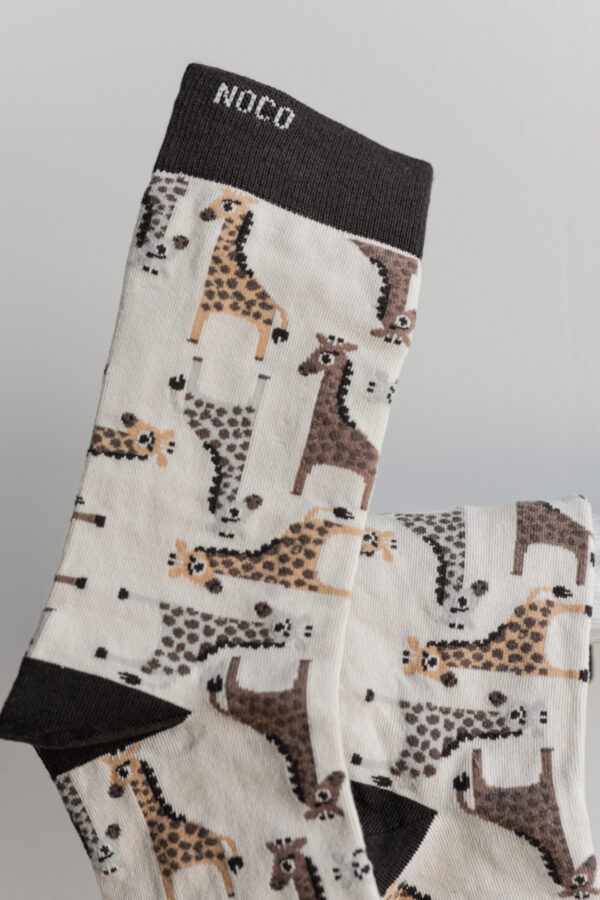 Dale un paso adelante a tu look con los calcetines NOCO, diseñados para quienes buscan estilo sin renunciar al confort. Con estampados originales y detalles en color liso en la puntera, talón y goma superior, estos calcetines unisex combinan diseño moderno con funcionalidad. Estampado de jirafas en distintos tonos de color.