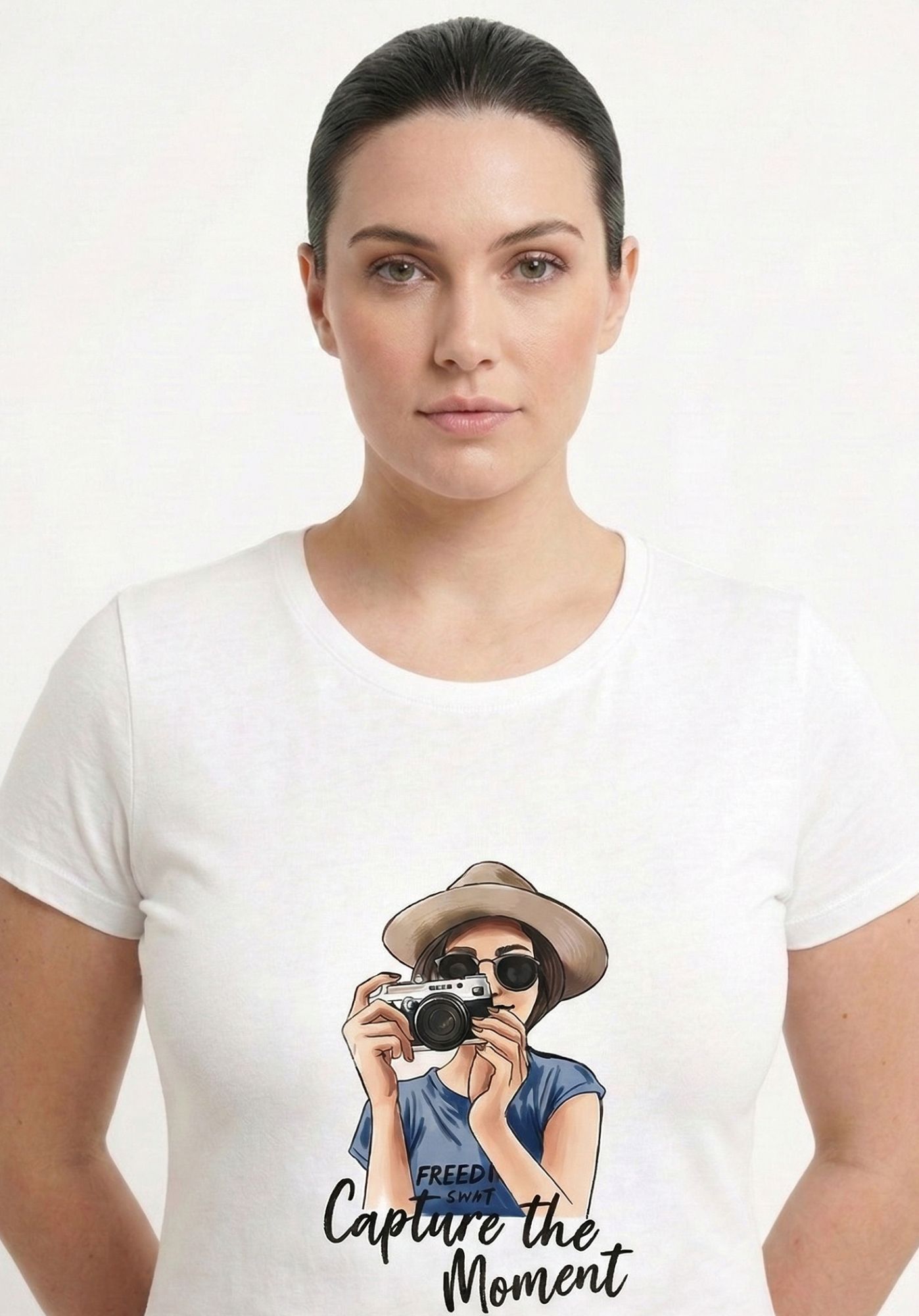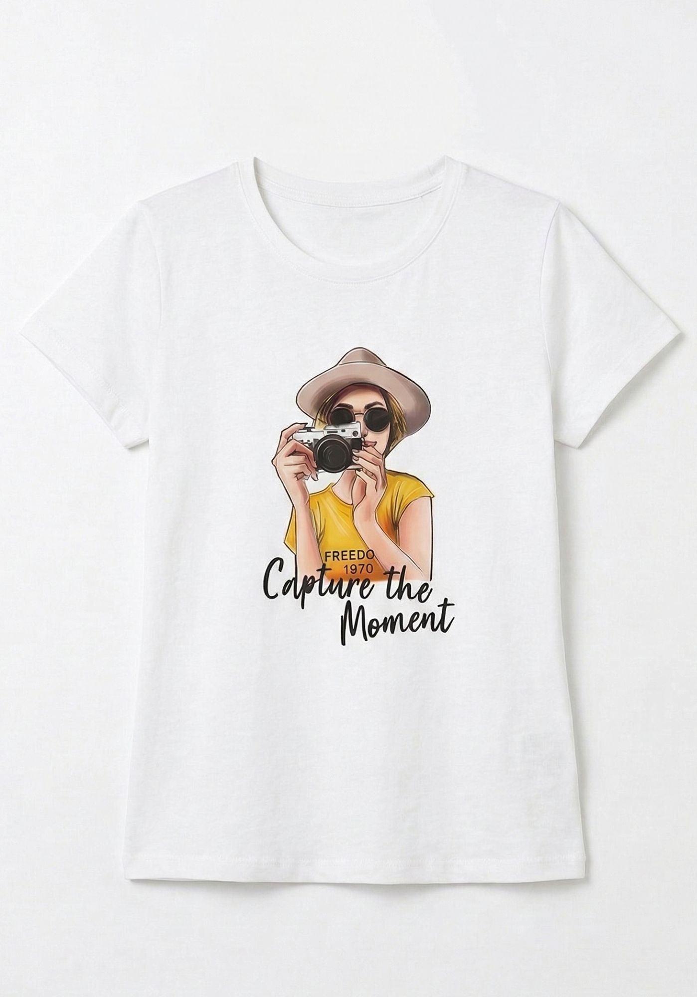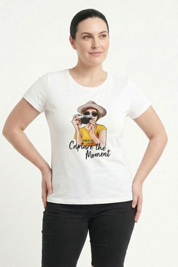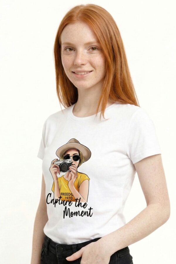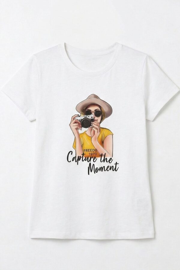 El diseño frontal presenta el estampado de una chica con una cámara de fotos, acompañado de la frase “Capture the moment” bordada sobre la ilustración, aportando textura y un detalle diferencial.