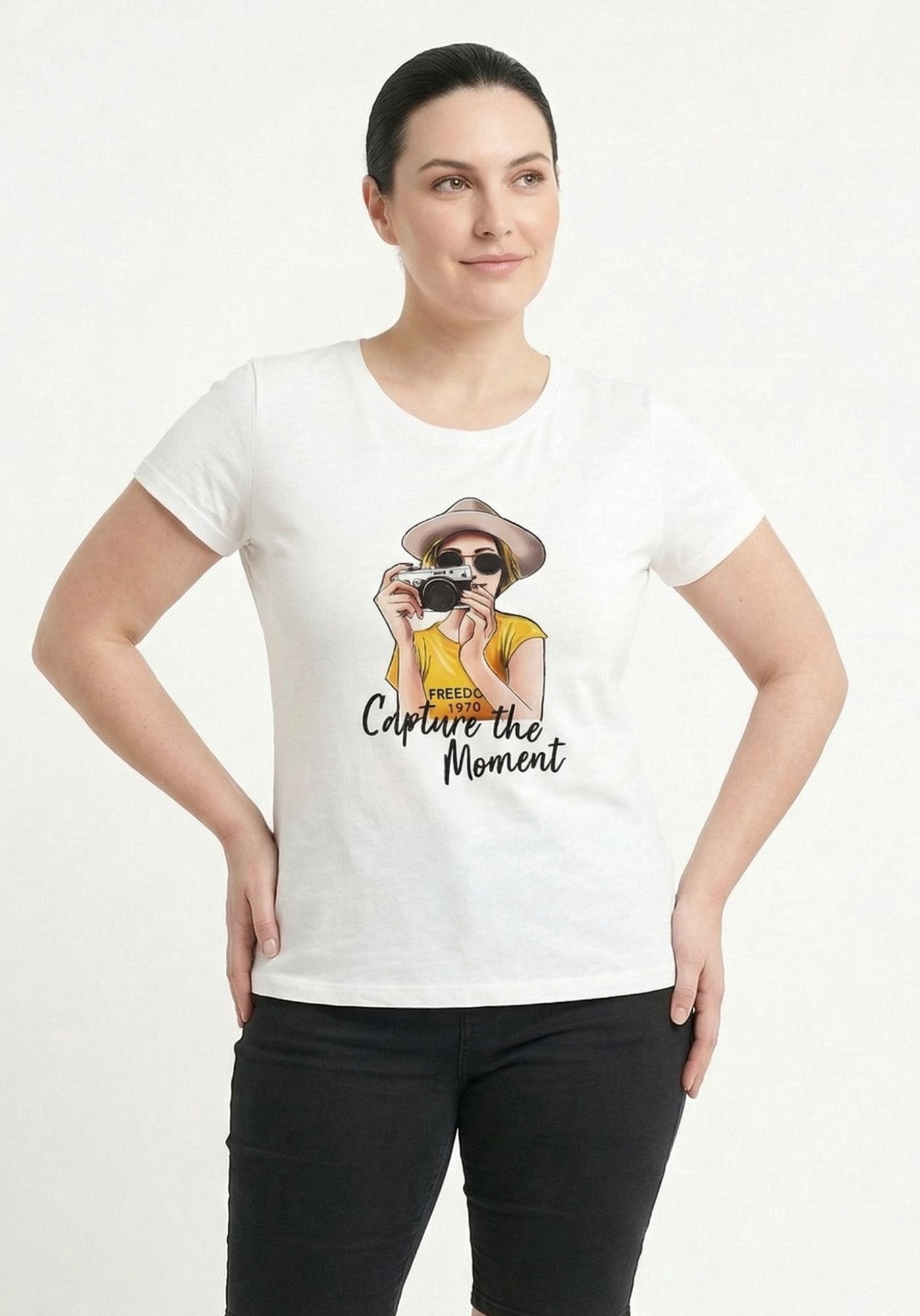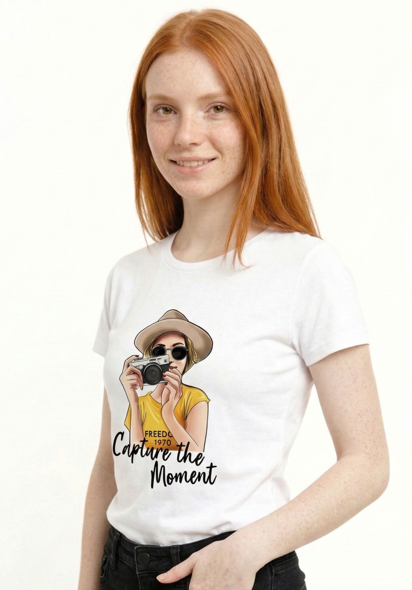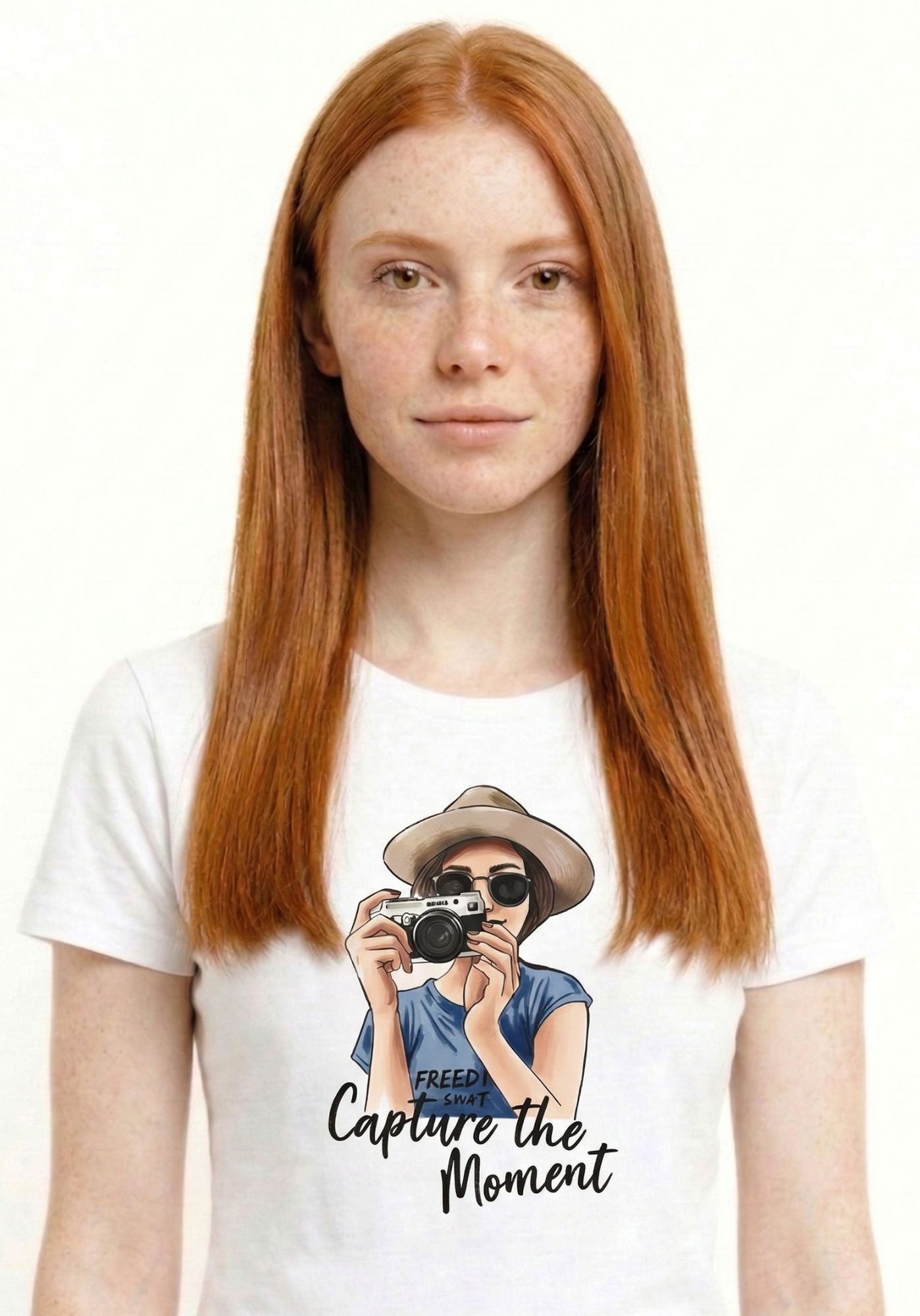 El diseño frontal presenta el estampado de una chica con una cámara de fotos, acompañado de la frase “Capture the moment” bordada sobre la ilustración, aportando textura y un detalle diferencial.