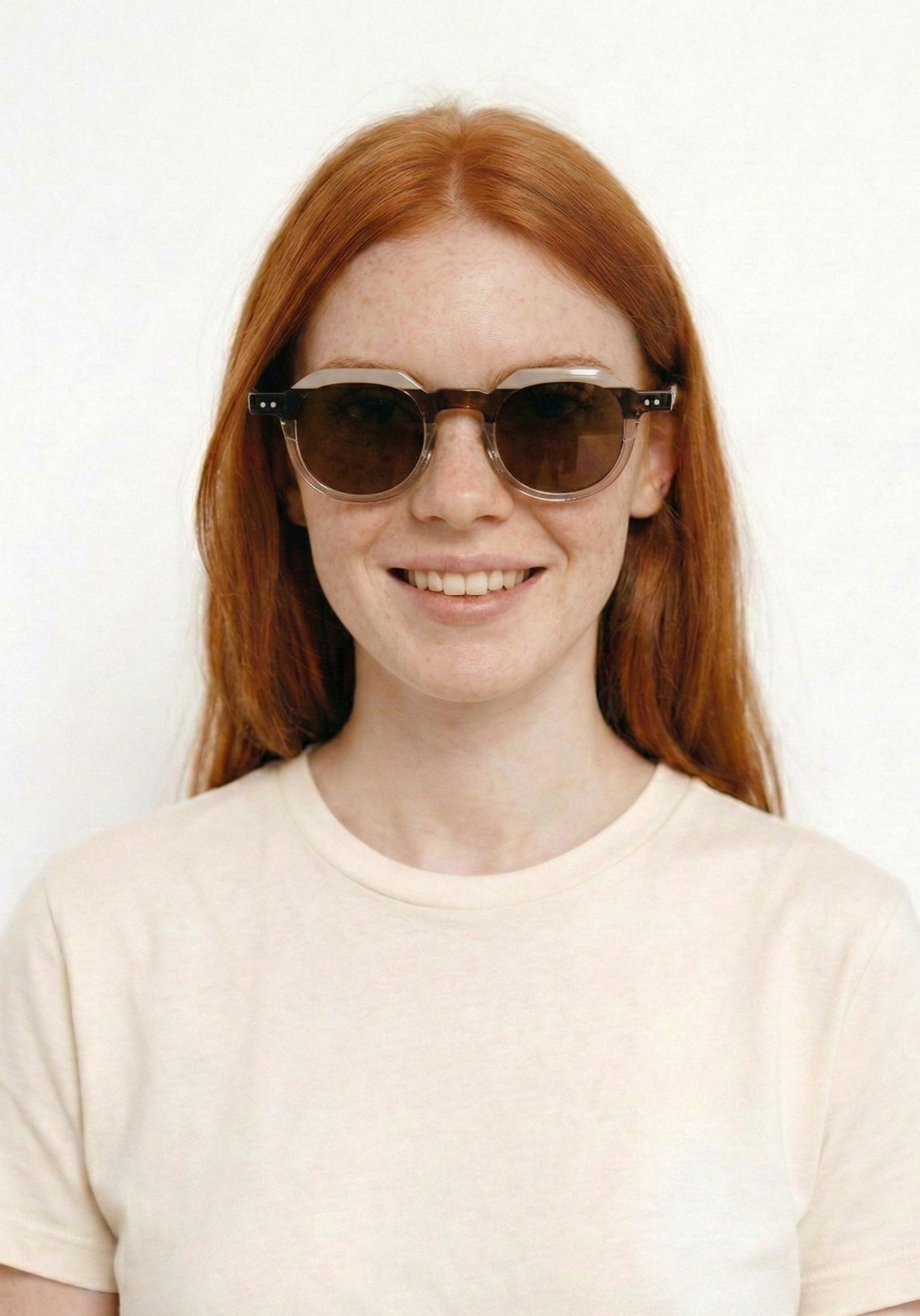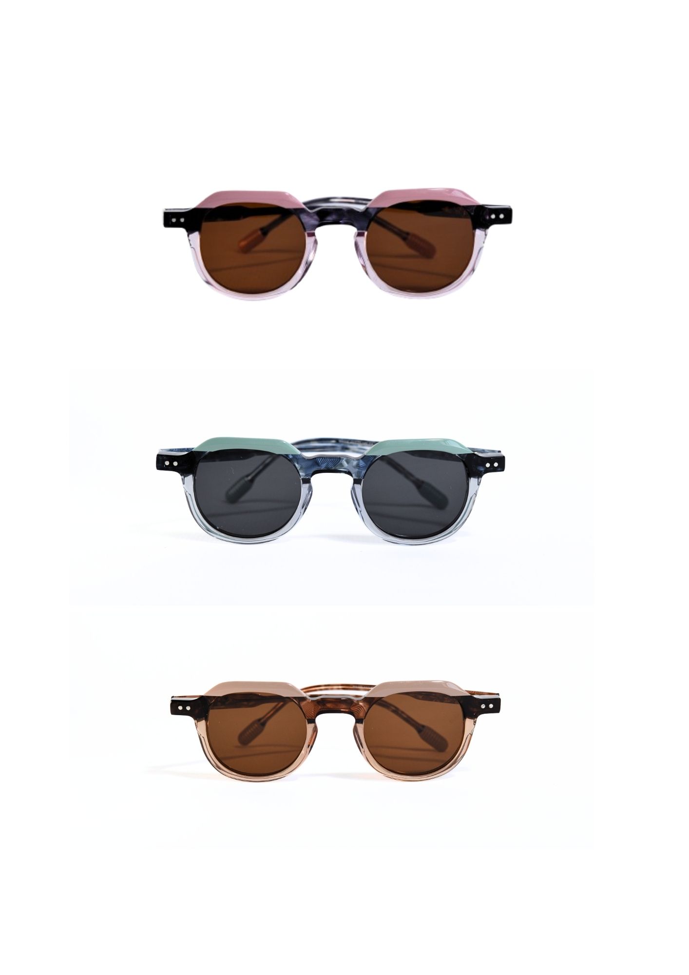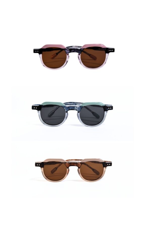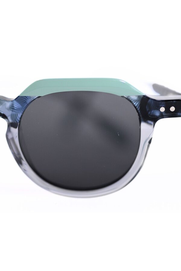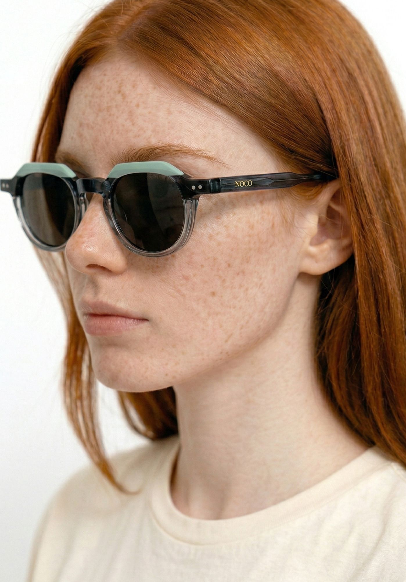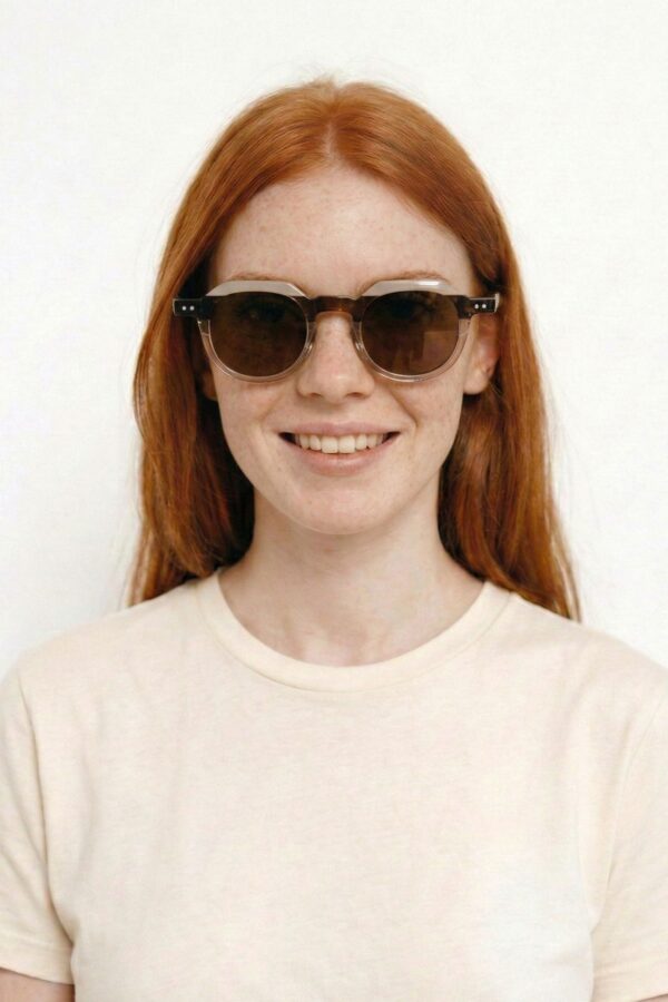 Las gafas de sol Roma NOCO destacan por su montura de pasta en combinación tricolor, con dos zonas en acabado transparente y una en color sólido, todas dentro de la misma gama tonal.