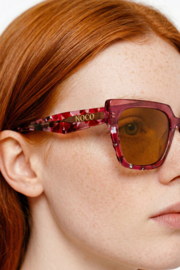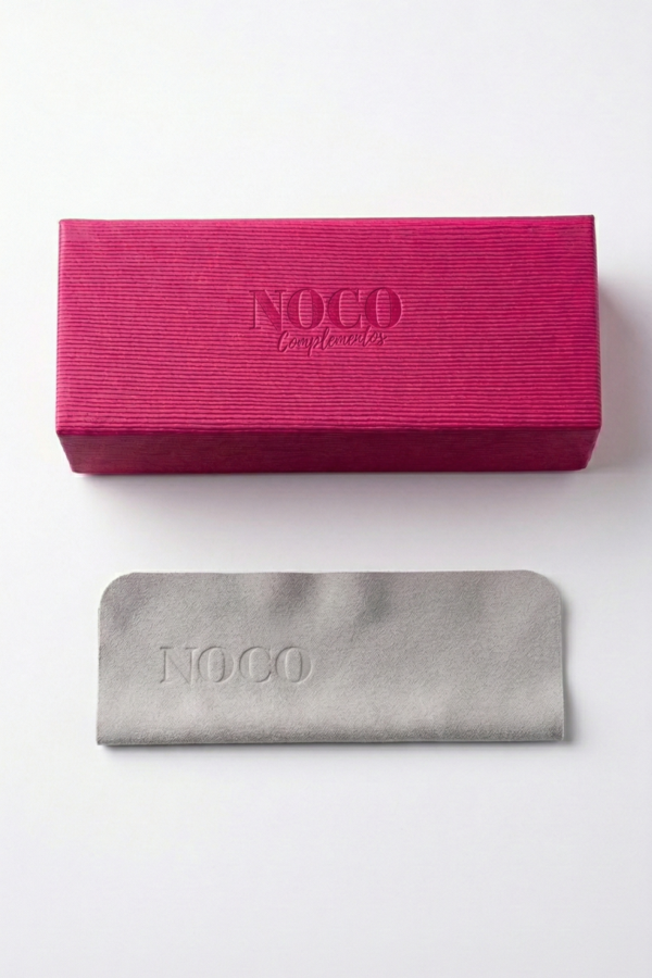 Cada par de gafas de la colección NOCO se presenta en una elegante funda de piel vegana rosa fucsia, diseñada con nuestro logo y alineada con la identidad de la marca.
