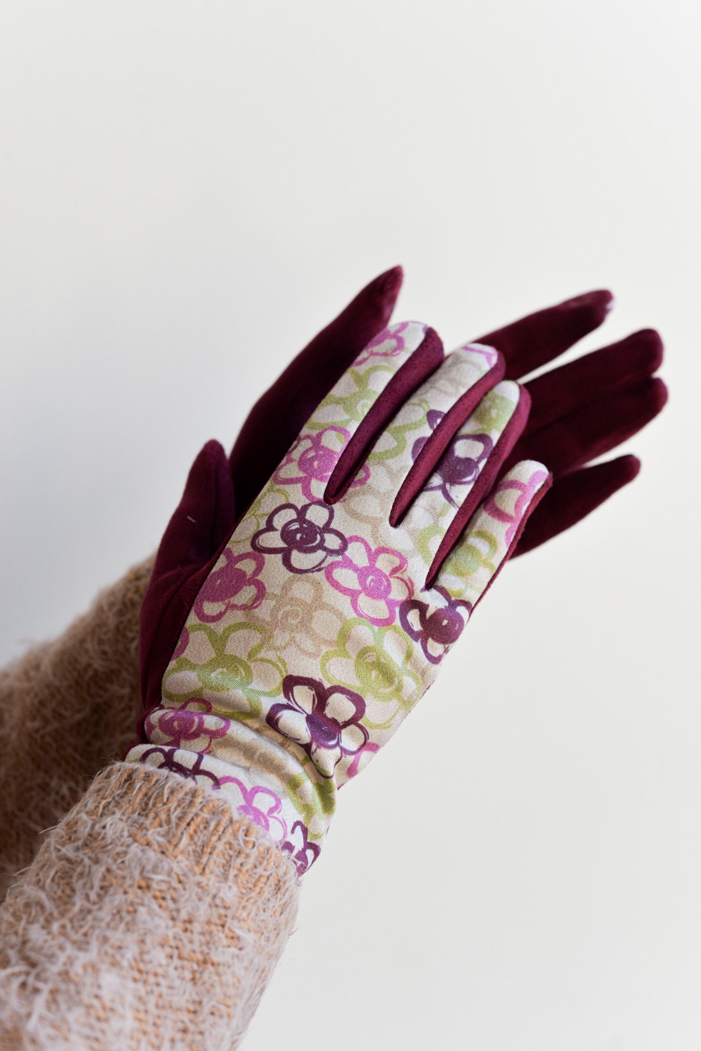 Guantes diseñados en antelina elástica con estampado en la parte superior del guante y color liso en la parte de la base.