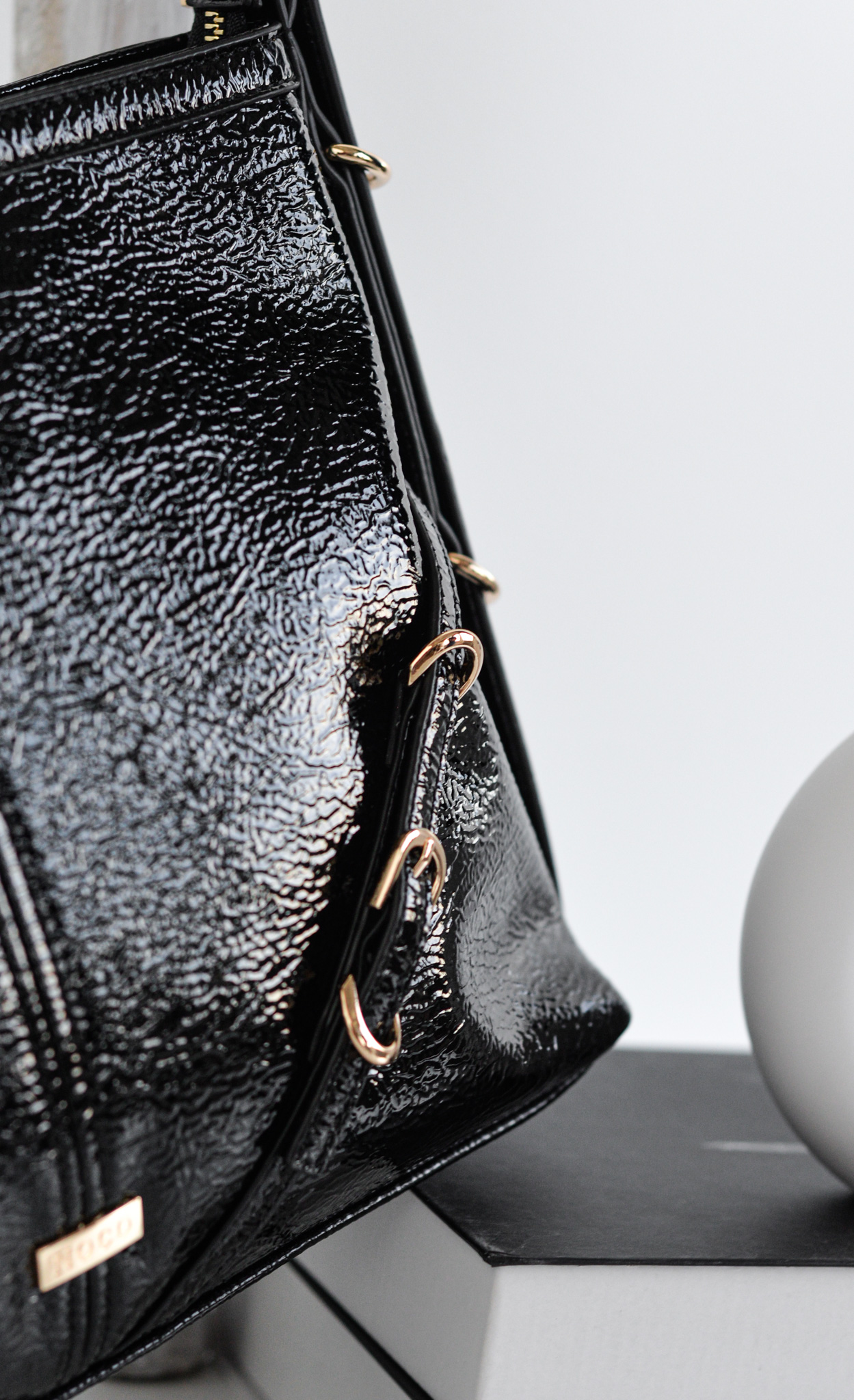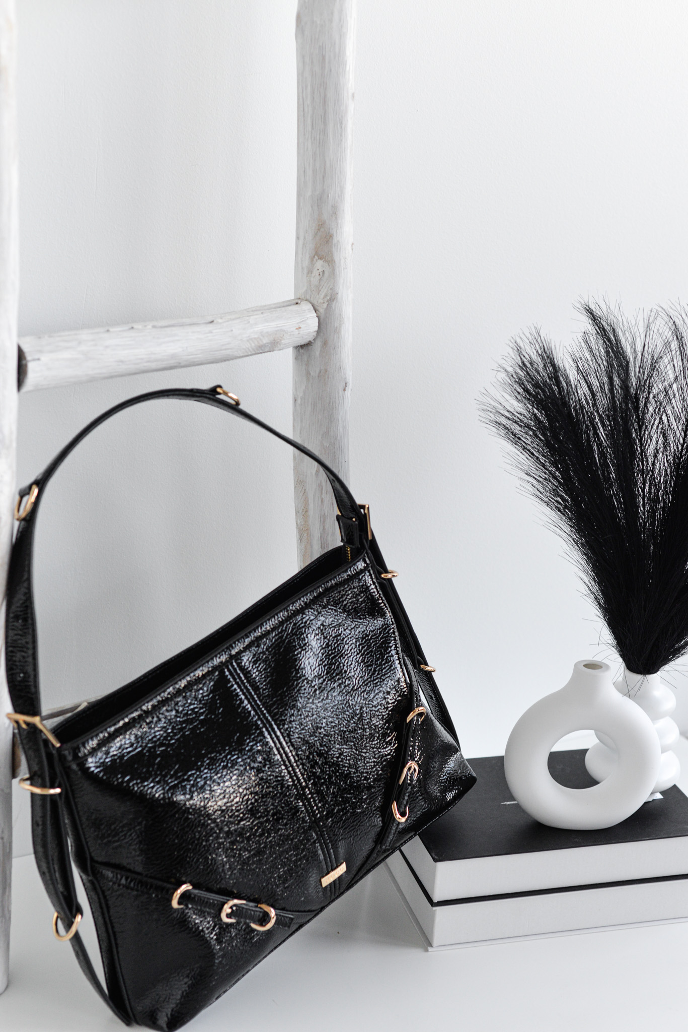 Bolso hobo grande y de formato cuadrado, confeccionado en charol negro con textura. Su diseño estructurado combina fuerza visual y funcionalidad, convirtiéndolo en ese bolso que habla por sí solo.