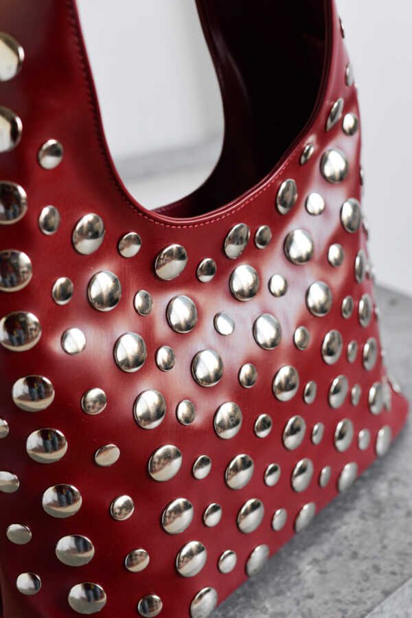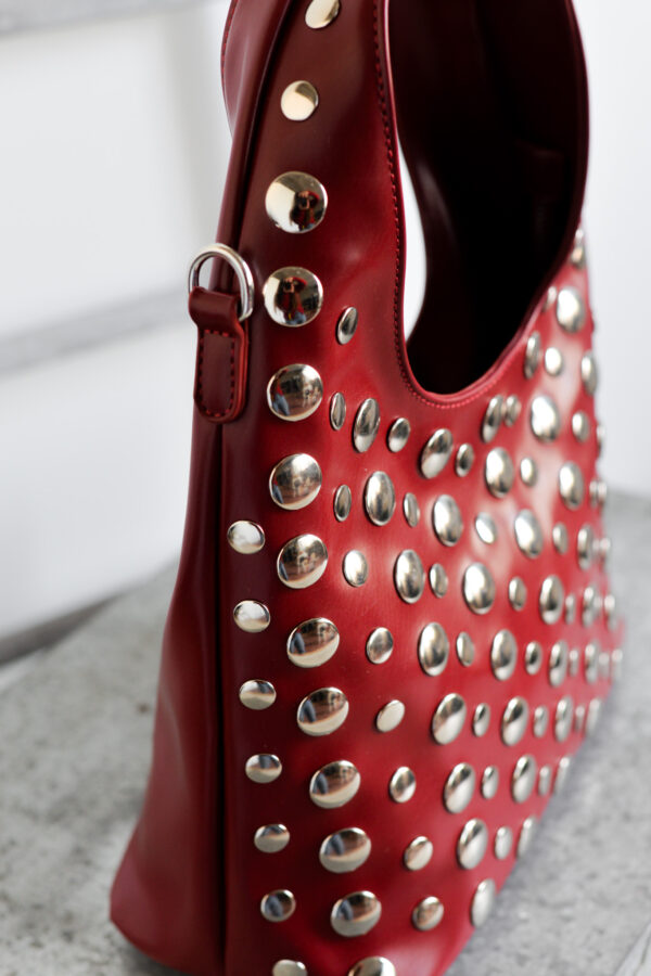 Este bolso hobo mediano redefine la actitud con un diseño estructurado que no pasa desapercibido. Fabricado en piel sintética gruesa, está cubierto por grandes tachuelas que le dan un aire rockero y moderno a la vez.