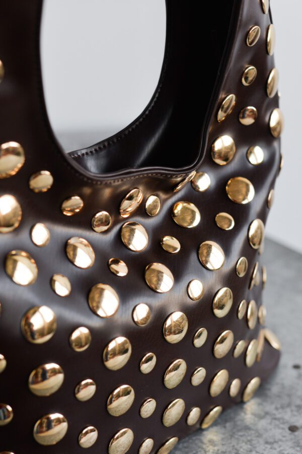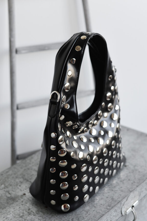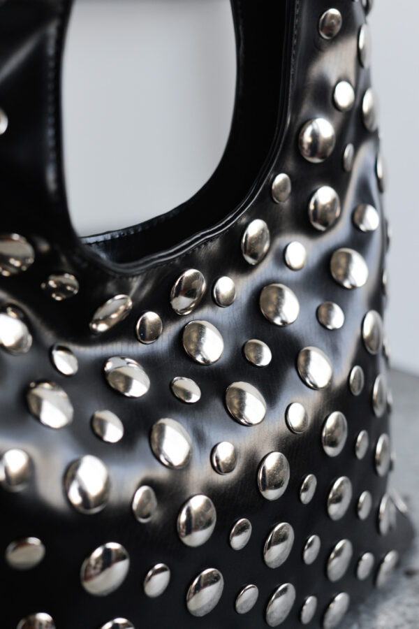 Su asa añade un detalle elegante que contrasta con la rebeldía de las tachuelas, creando un equilibrio perfecto entre sofisticación y fuerza.