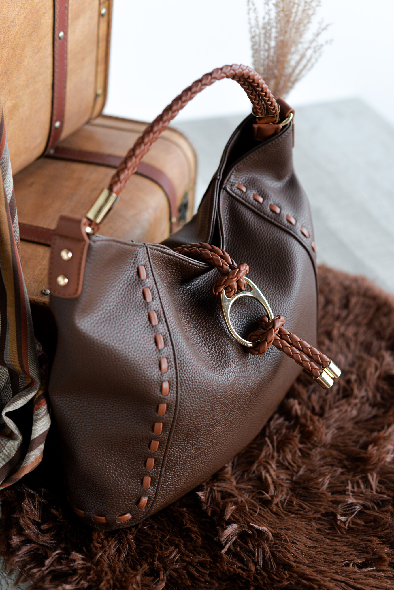 El protagonista absoluto es su asa trenzada, que aporta textura y personalidad. En el centro, un aplique decorativo en forma de óvalo metálico, unido con la misma trenza del asa, añade un toque original y sofisticado. Todo el conjunto está rematado con pespuntes decorativos y una práctica cremallera superior para mayor seguridad.